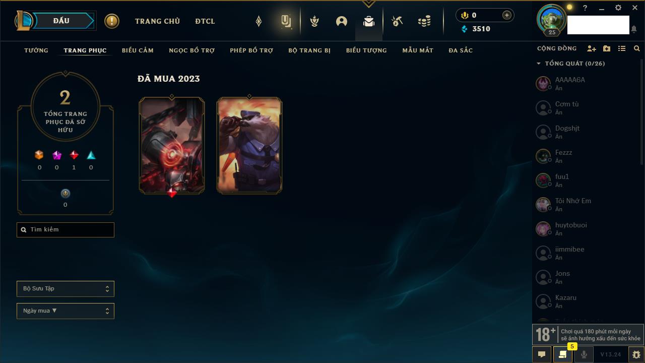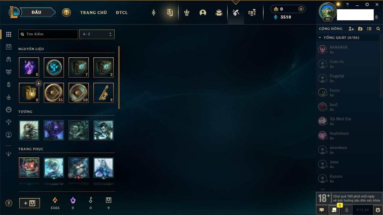 Rank Đơn: Chưa rank mùa nàoKhung: Chưa có khungTướng: 161 - Còn 11380 THXTrang Phục: 13Rank ĐTCL: Chưa RankLinh Thú: 74