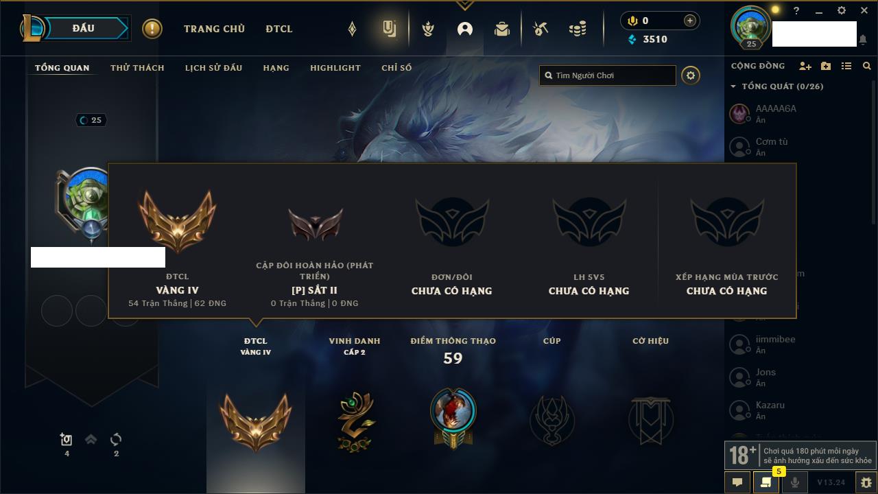 Rank Đơn: Chưa rank mùa nàoKhung: Chưa có khungTướng: 156 - Còn 18550 THXTrang Phục: 4Rank ĐTCL: Chưa RankLinh Thú: 75