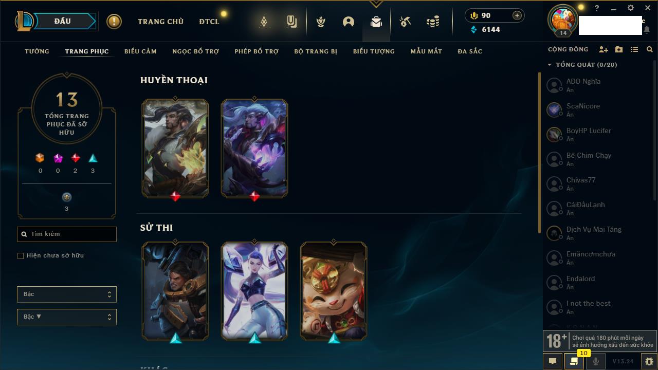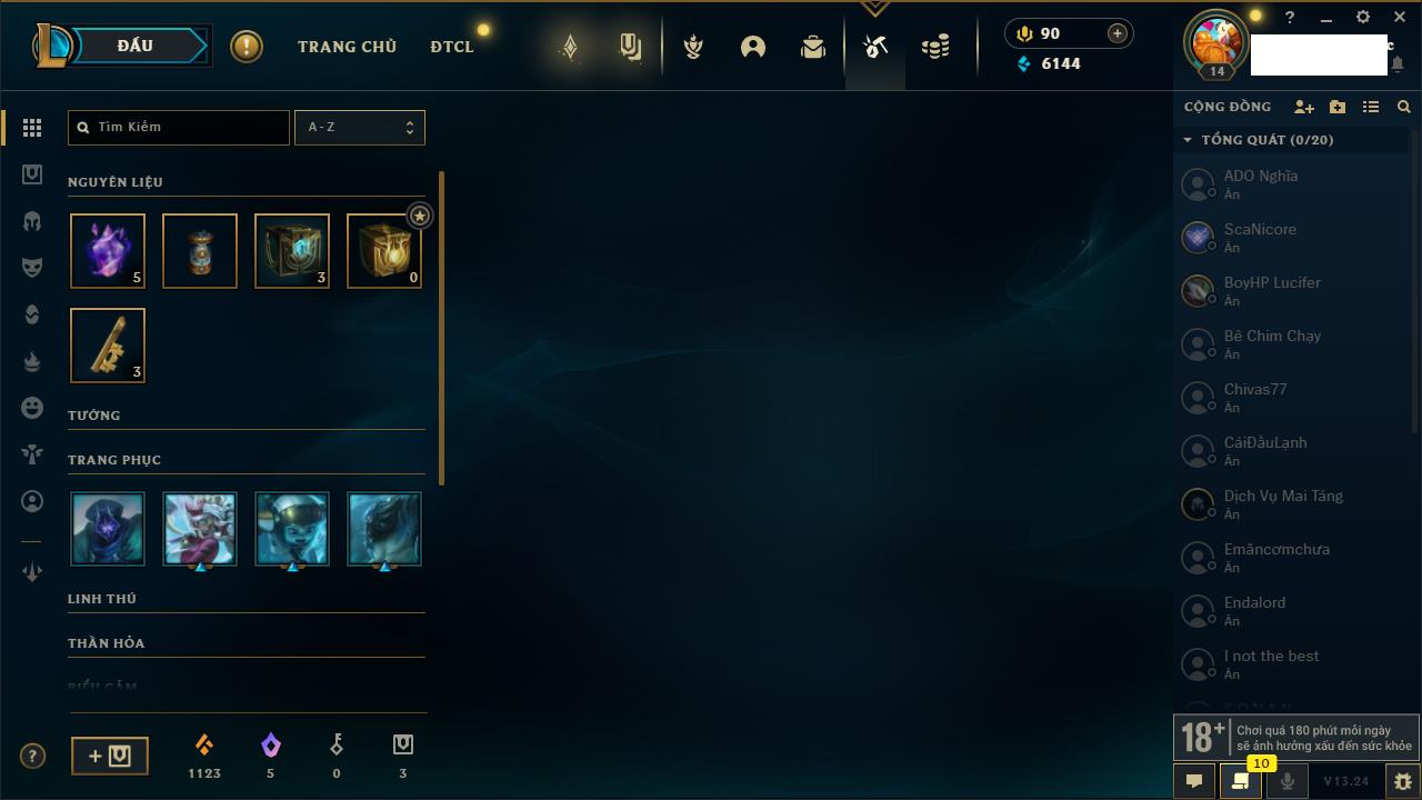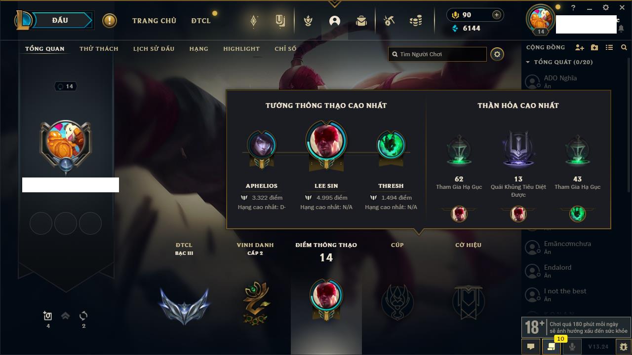 Rank Đơn: Chưa RankKhung: Chưa có khungTướng: 157 - Còn 6232 THXTrang Phục: 60Rank ĐTCL: Chưa RankLinh Thú: 89
