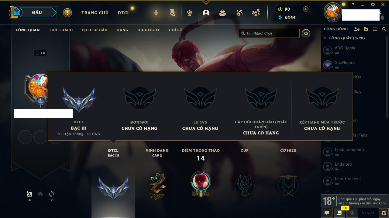 Rank Đơn: Đồng IIKhung: ĐồngTướng: 172 - Còn 35937 THXTrang Phục: 81Rank ĐTCL: Chưa RankLinh Thú: 38