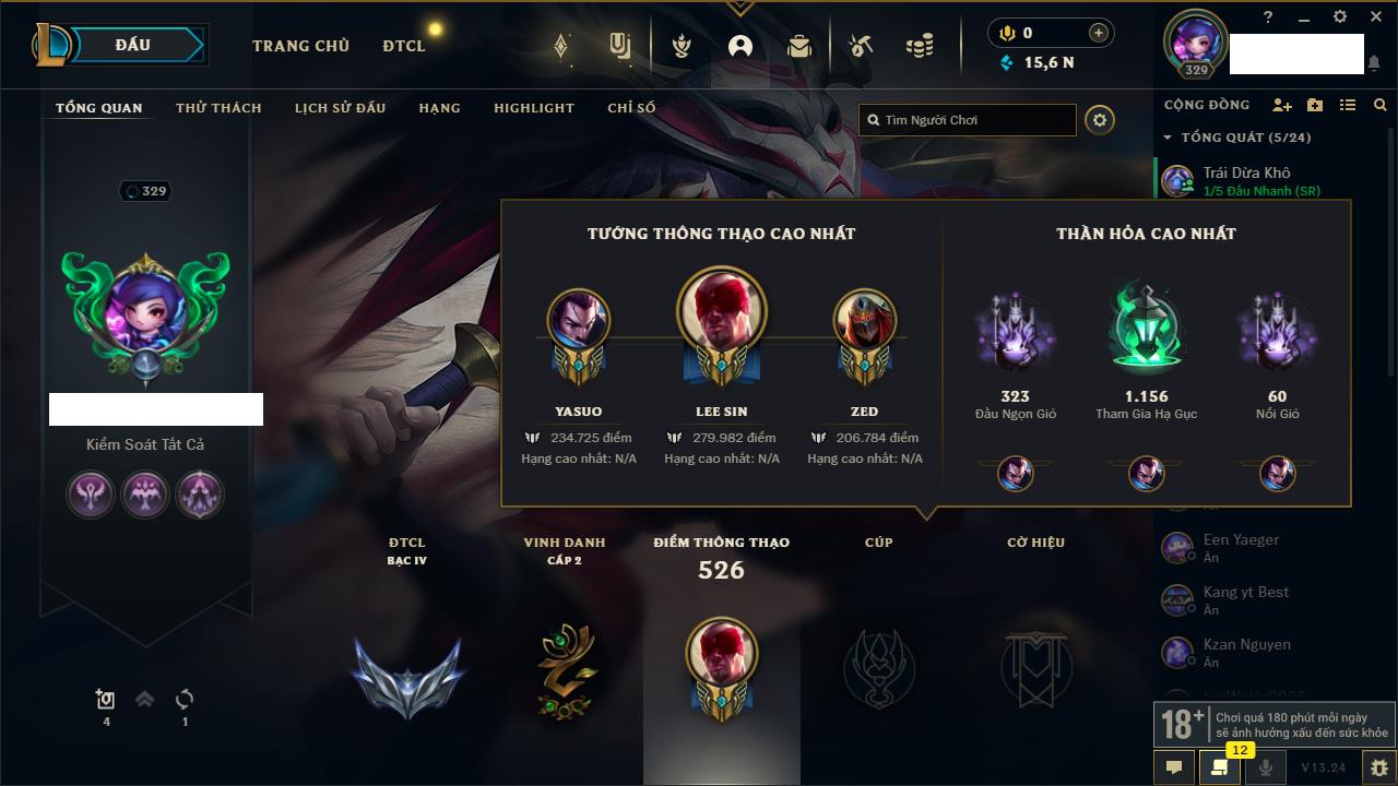 Rank Đơn: Lục Bảo IVKhung: Bạch kimTướng: 171 - Còn 128452 THXTrang Phục: 193Rank ĐTCL: Bạc IIILinh Thú: 100