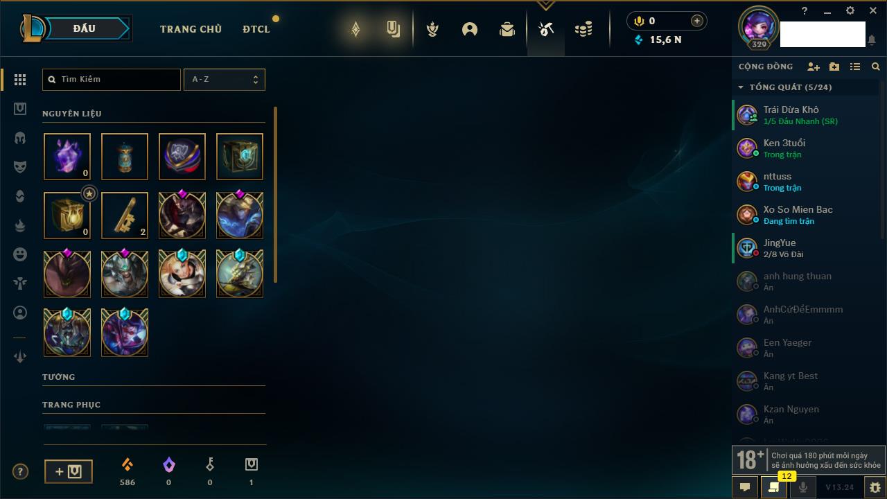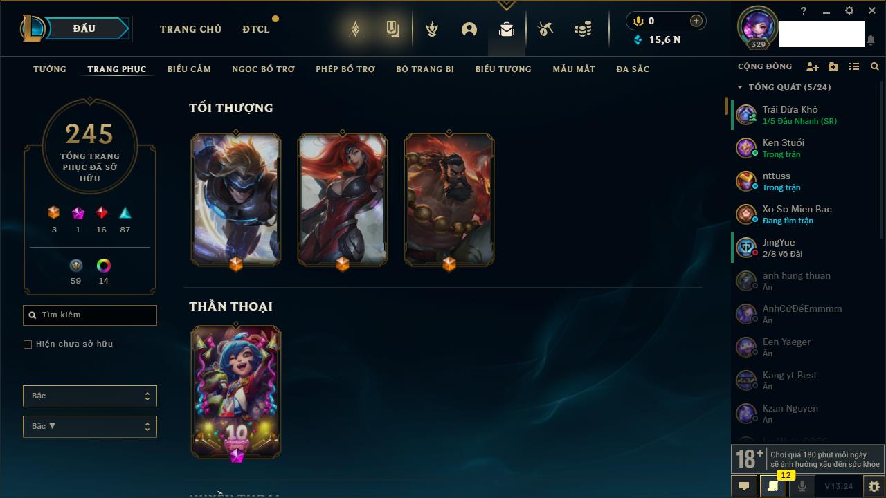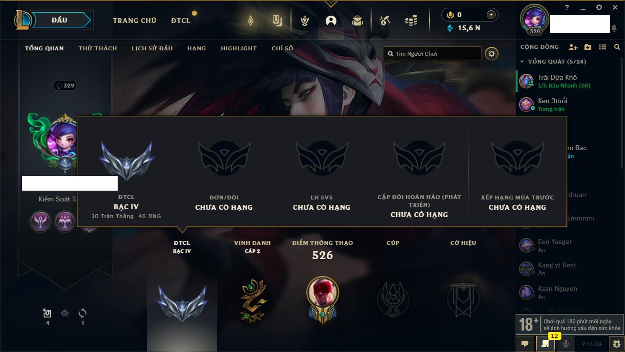 Rank Đơn: Vàng IIIKhung: BạcTướng: 171 - Còn 101359 THXTrang Phục: 88Rank ĐTCL: Kim Cương IVLinh Thú: 200