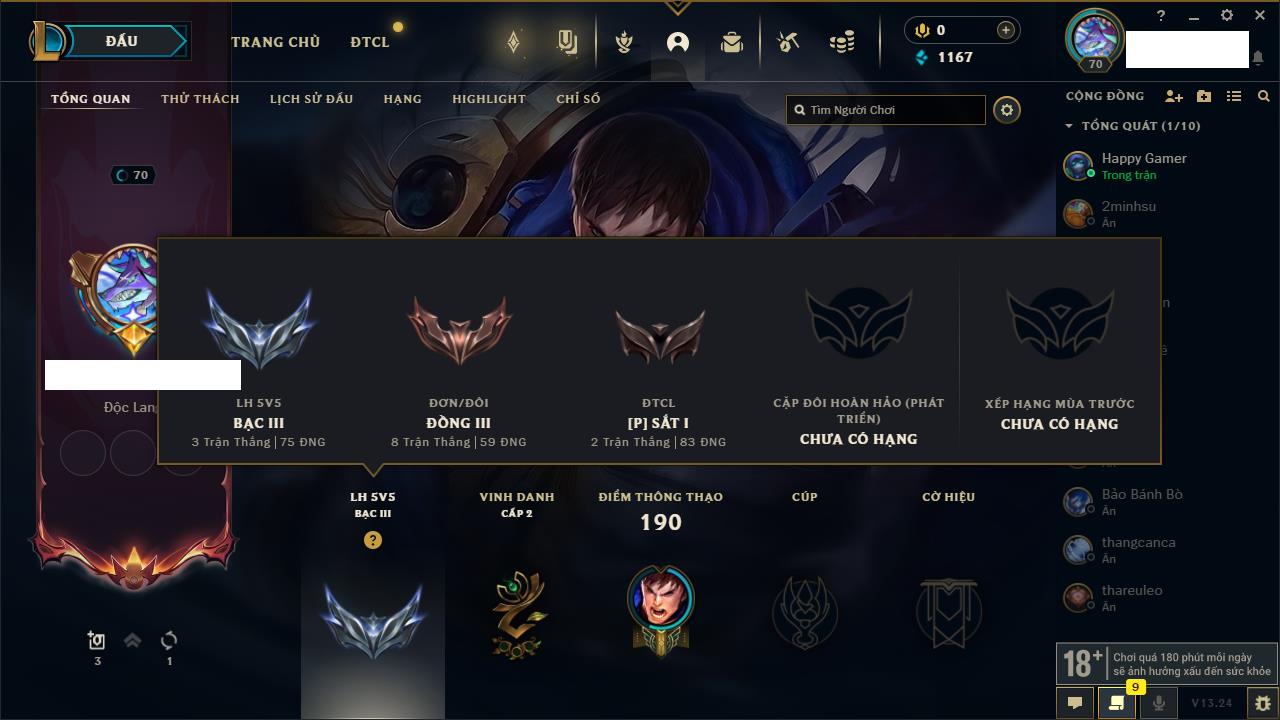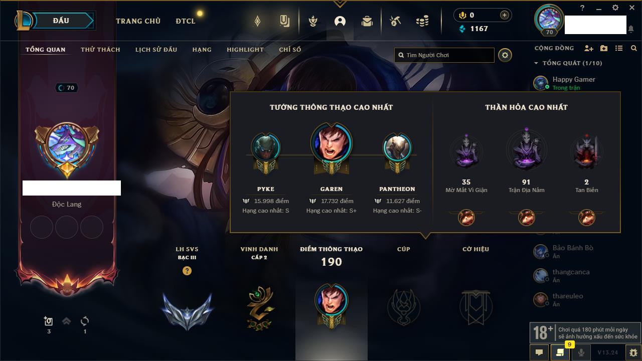 Rank Đơn: Vàng IVKhung: BạcTướng: 166 - Còn 180925 THXTrang Phục: 163Rank ĐTCL: Chưa RankLinh Thú: 67