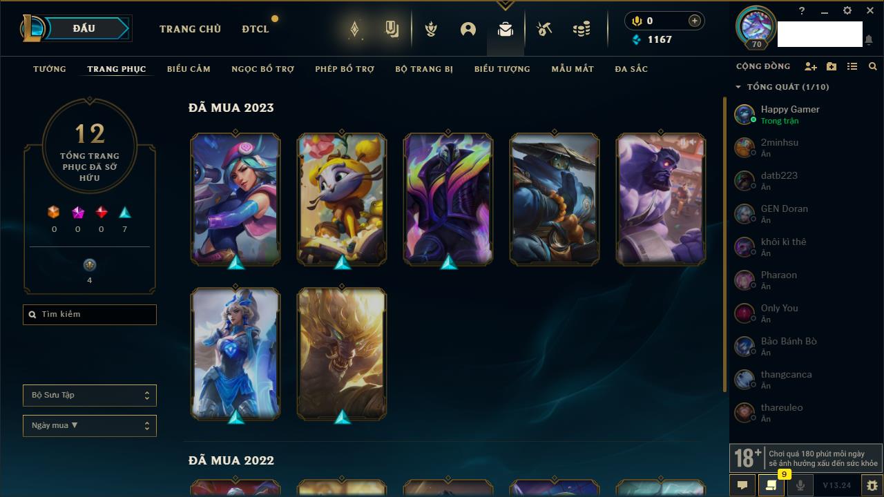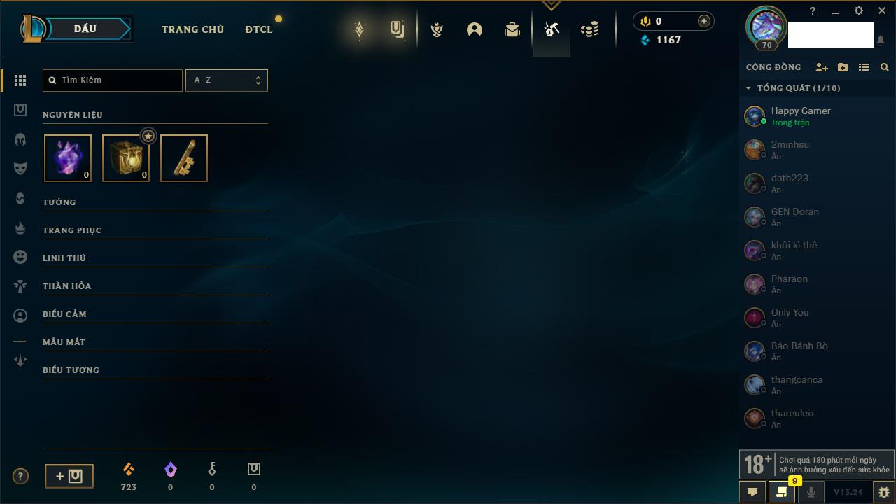 Rank Đơn: Vàng IVKhung: VàngTướng: 171 - Còn 48721 THXTrang Phục: 171Rank ĐTCL: Chưa RankLinh Thú: 27