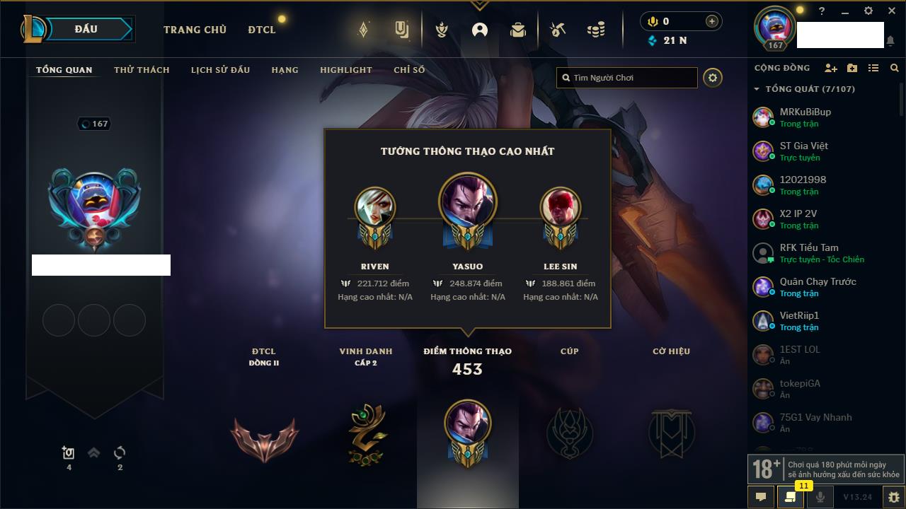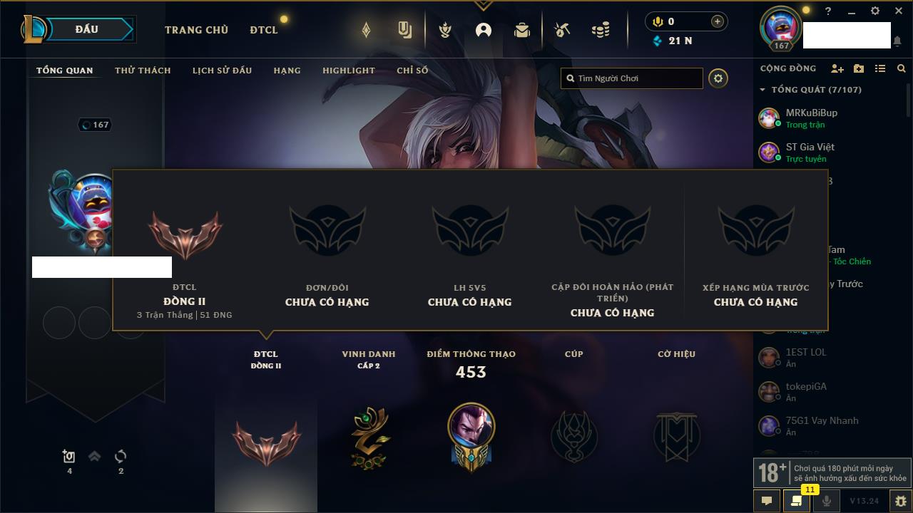 Rank Đơn: Chưa rank mùa nàoKhung: Chưa có khungTướng: 36 - Còn 190 THXTrang Phục: 14Rank ĐTCL: Chưa RankLinh Thú: 65