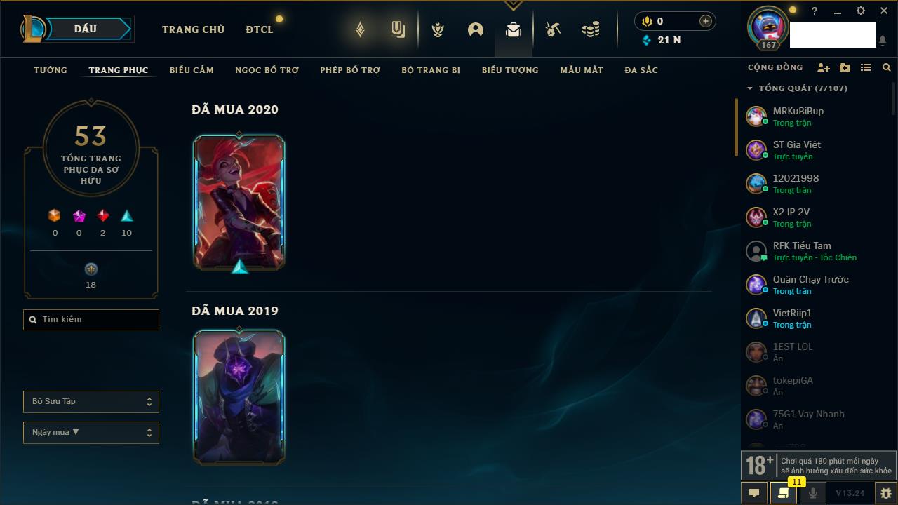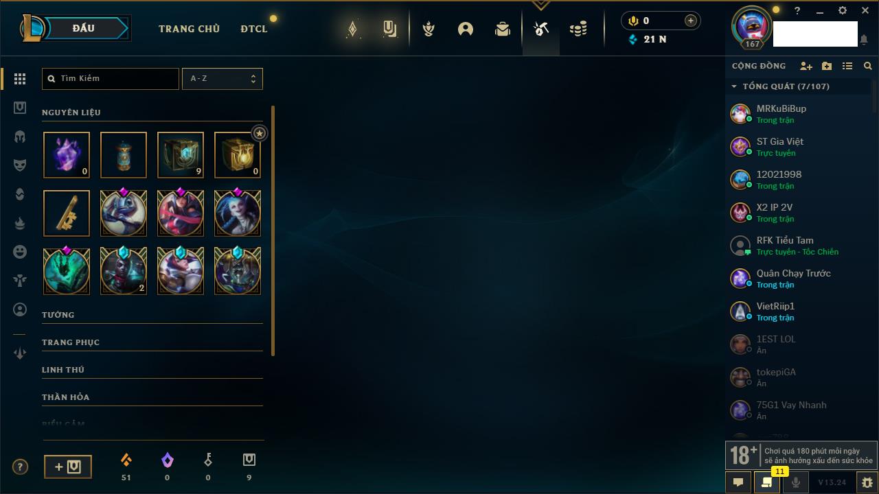 Rank Đơn: Chưa rank mùa nàoKhung: Chưa có khungTướng: 158 - Còn 6970 THXTrang Phục: 32Rank ĐTCL: Chưa RankLinh Thú: 24