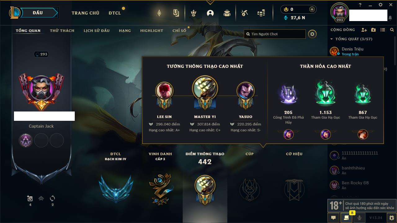 - Cấp 527 - 180,925 IP - Yasuo 634,686 Thông Thạo