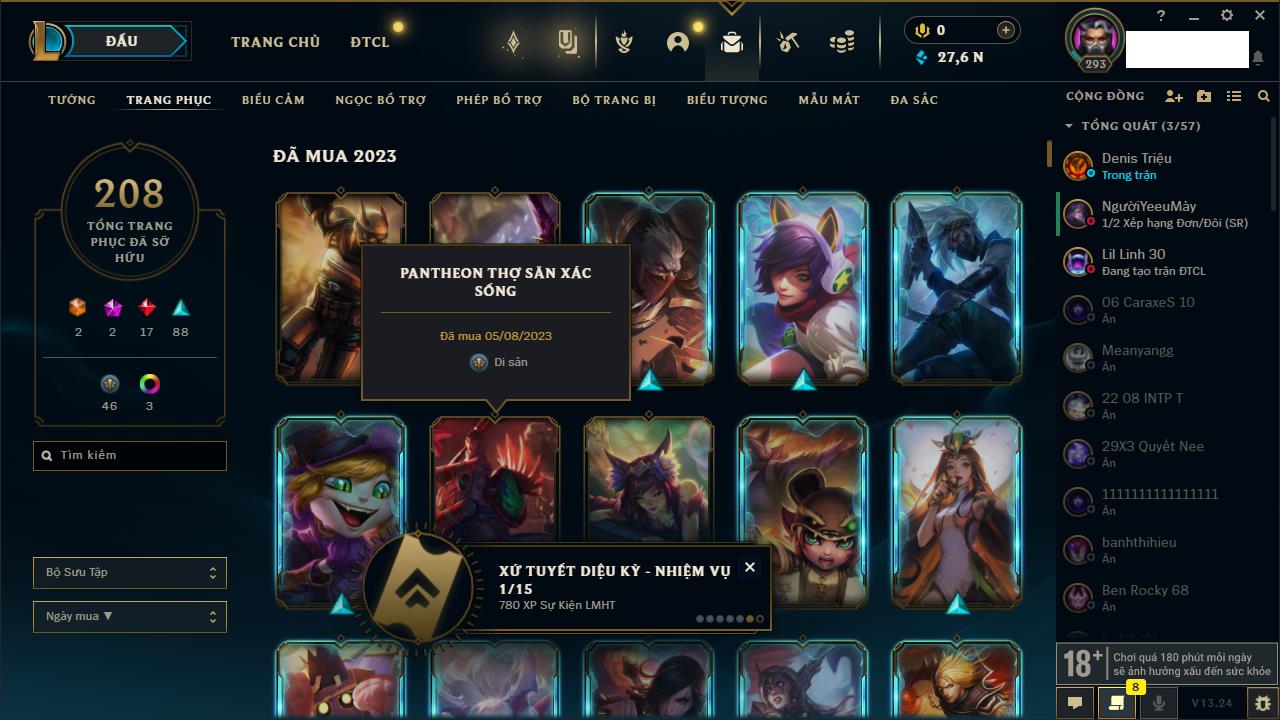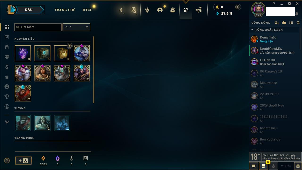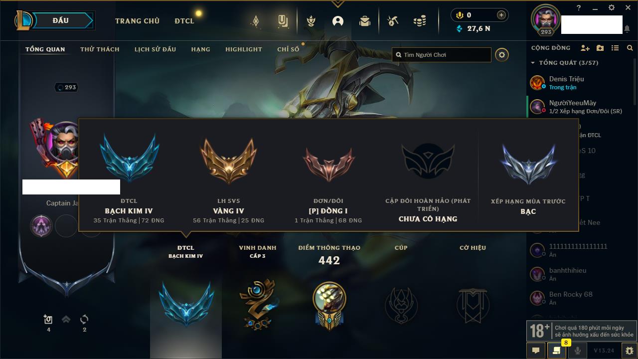 Rank Đơn: Bạc IVKhung: VàngTướng: 172 - Còn 358384 THXTrang Phục: 177Rank ĐTCL: Lục Bảo IILinh Thú: 211