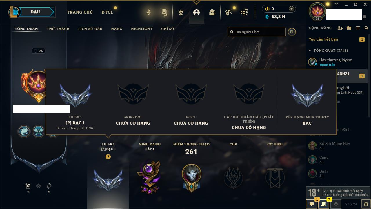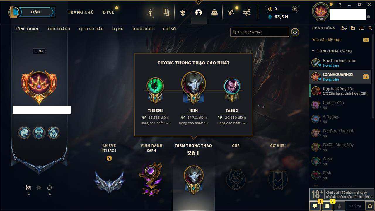 Rank Đơn: Chưa rank mùa nàoKhung: Chưa có khungTướng: 36 - Còn 190 THXTrang Phục: 14Rank ĐTCL: Chưa RankLinh Thú: 65