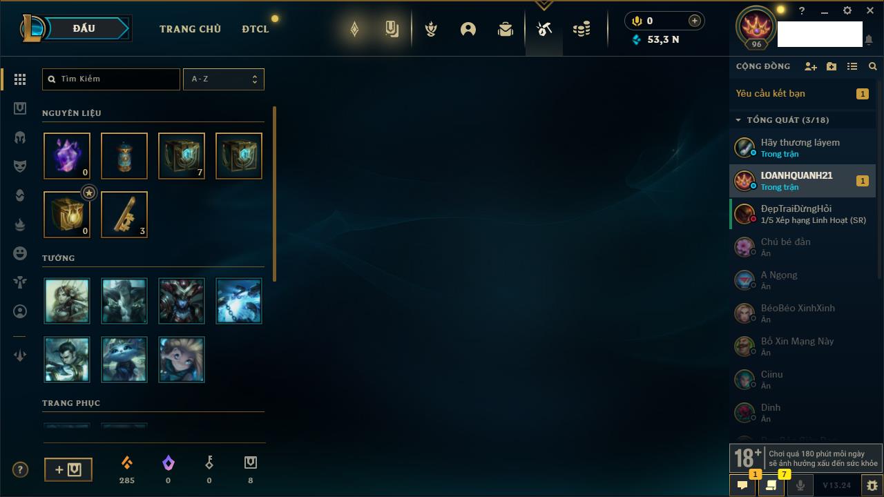 Rank Đơn: Chưa rank mùa nàoKhung: Chưa có khungTướng: 12 - Còn 3853 THXTrang Phục: 2Rank ĐTCL: Chưa RankLinh Thú: 30