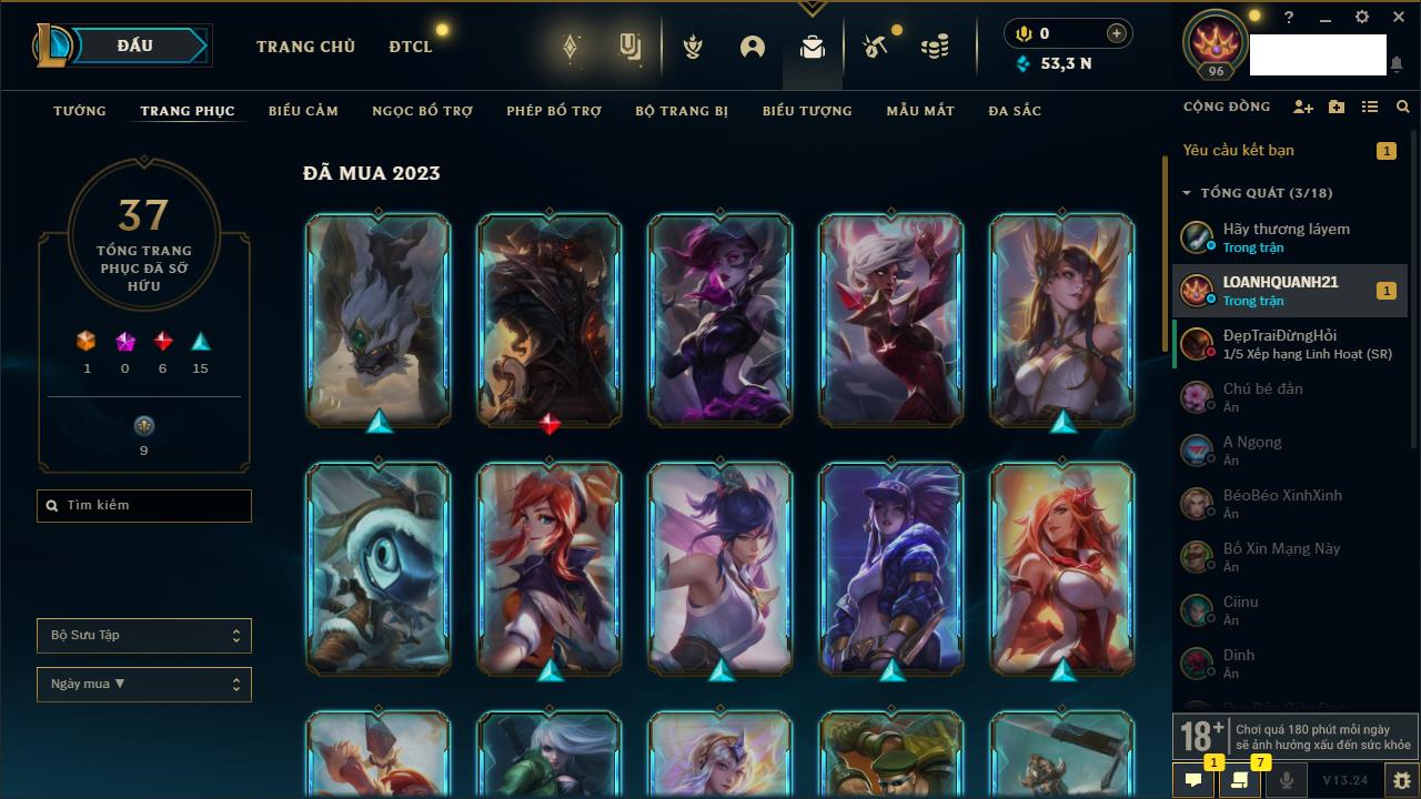 Rank Đơn: Chưa rank mùa nàoKhung: Chưa có khungTướng: 158 - Còn 6970 THXTrang Phục: 32Rank ĐTCL: Chưa RankLinh Thú: 24