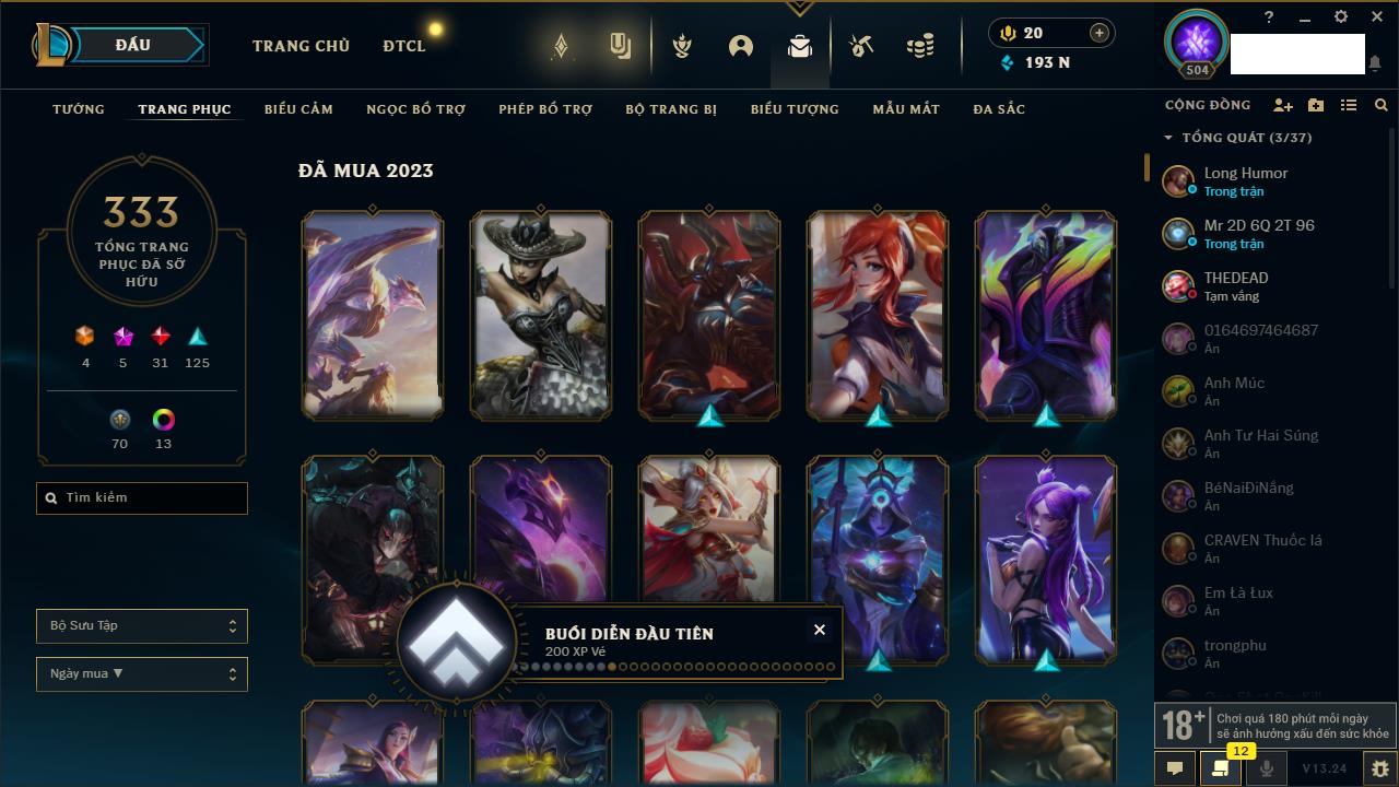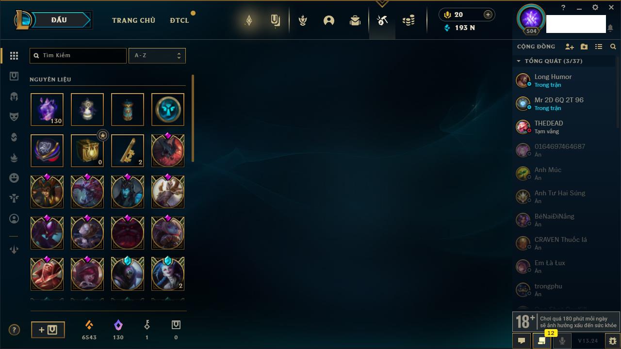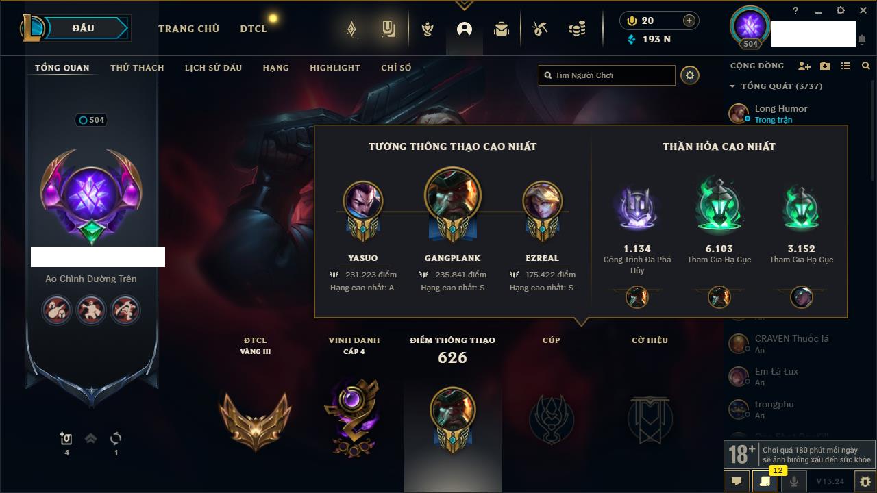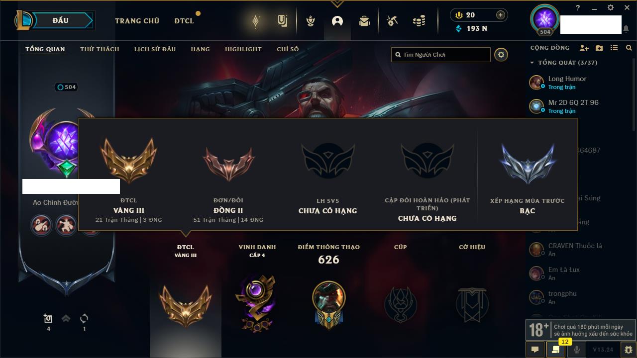 Rank Đơn: Vàng IKhung: Bạch kimTướng: 170 - Còn 212450 THXTrang Phục: 214Rank ĐTCL: Bạch Kim IVLinh Thú: 221