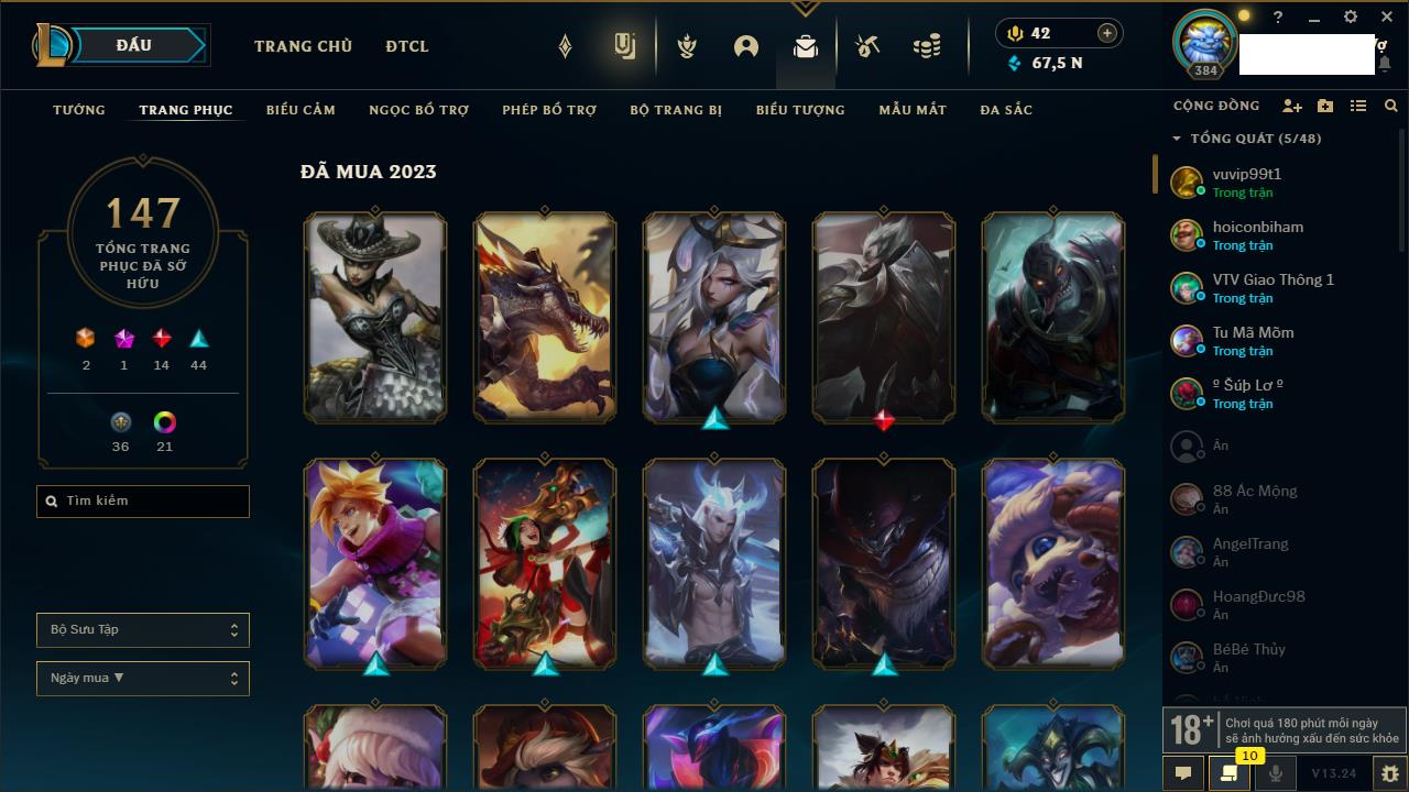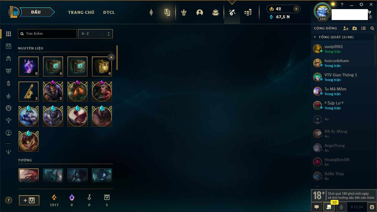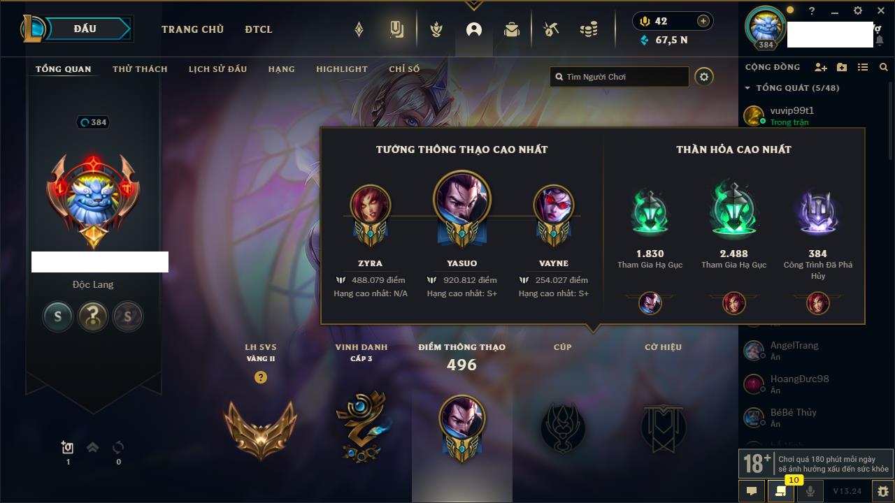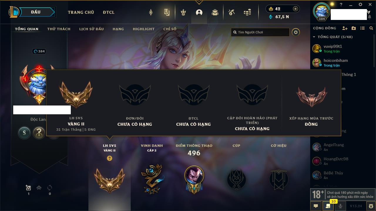 Rank Đơn: Đồng IIKhung: Chưa có khungTướng: 170 - Còn 56487 THXTrang Phục: 90Rank ĐTCL: Chưa RankLinh Thú: 129