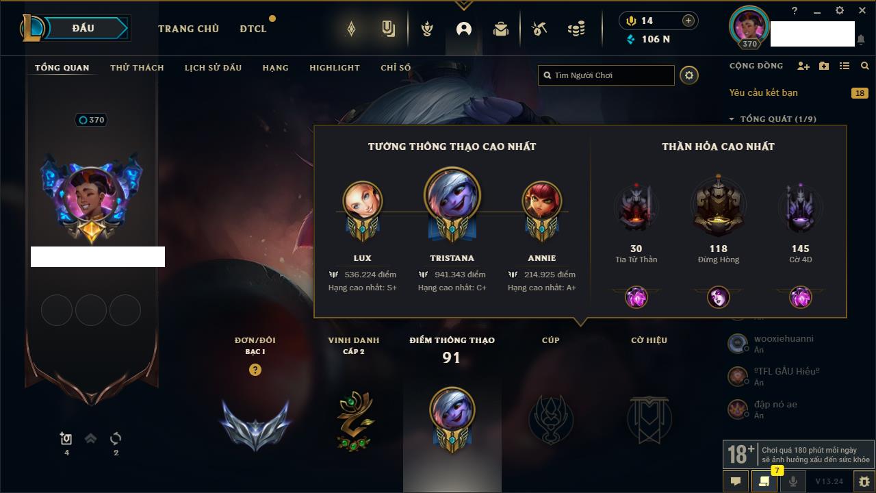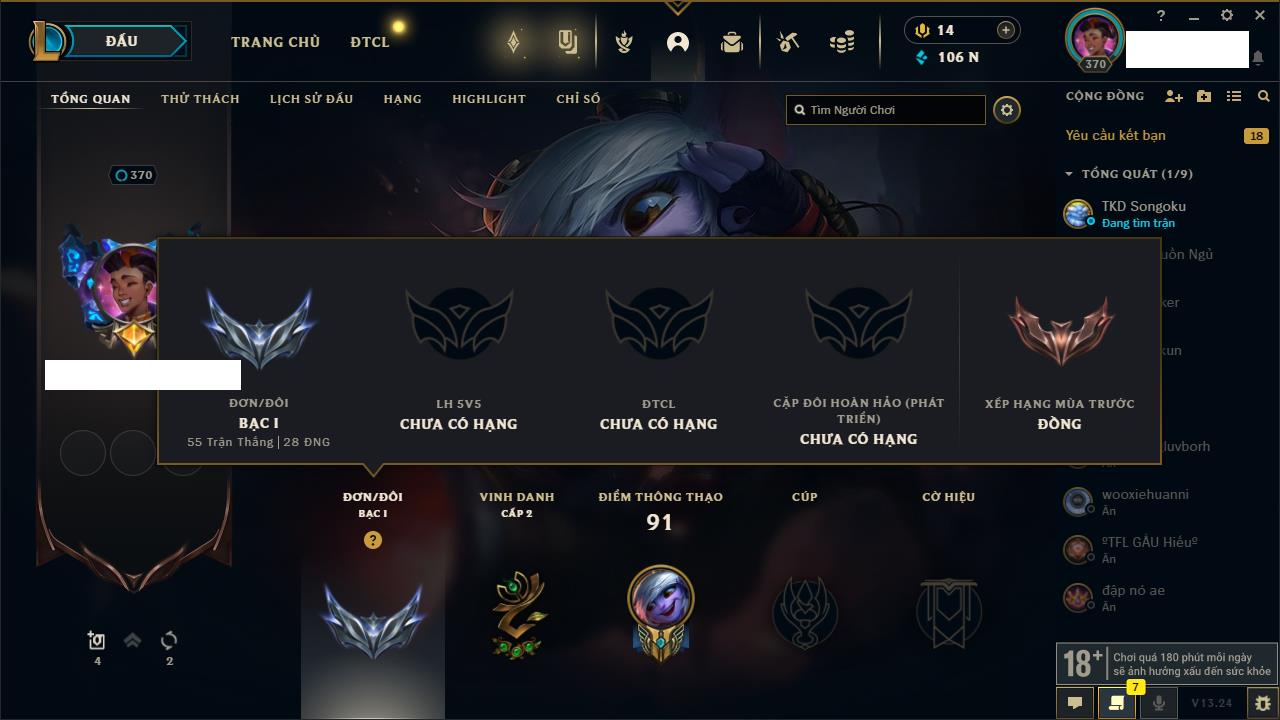 Rank Đơn: Đồng IIKhung: ĐồngTướng: 172 - Còn 35937 THXTrang Phục: 81Rank ĐTCL: Chưa RankLinh Thú: 38