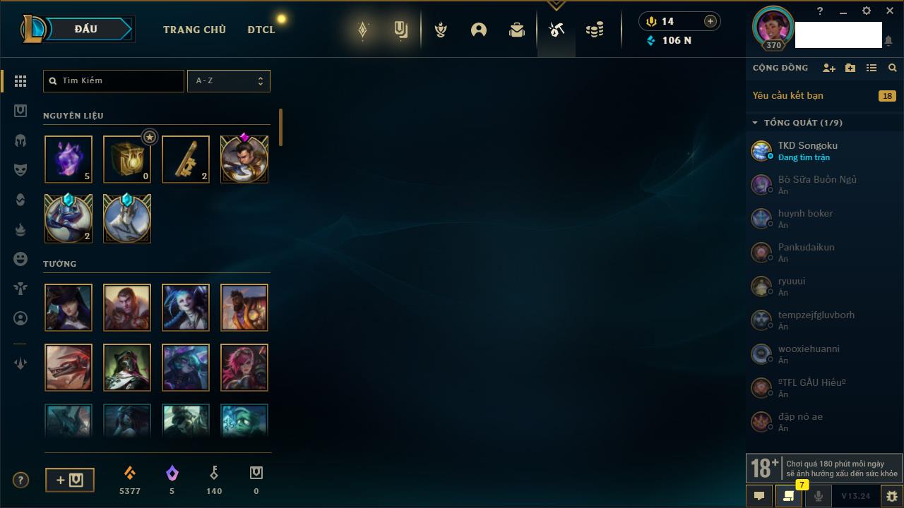 Rank Đơn: Chưa rank mùa nàoKhung: Chưa có khungTướng: 4 - Còn 30300 THXTrang Phục: 0Rank ĐTCL: Bạch Kim IVLinh Thú: 36