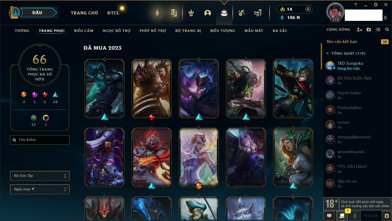 Rank Đơn: Chưa RankKhung: Chưa có khungTướng: 157 - Còn 6232 THXTrang Phục: 60Rank ĐTCL: Chưa RankLinh Thú: 89