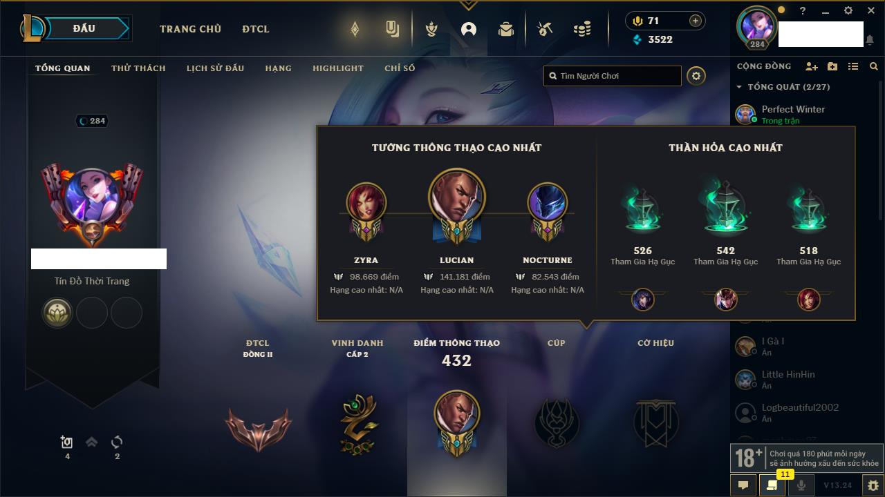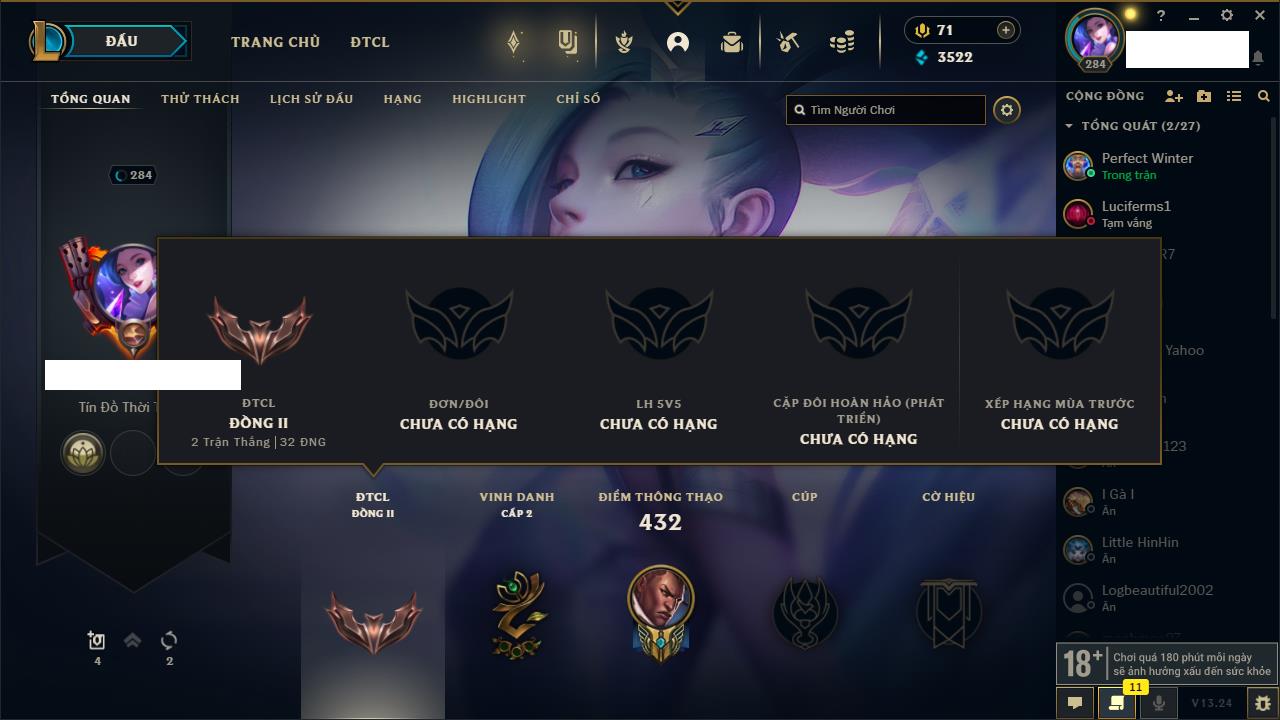 Rank Đơn: Kim Cương IIKhung: Kim cươngTướng: 170 - Còn 91601 THXTrang Phục: 269Rank ĐTCL: Chưa RankLinh Thú: 97