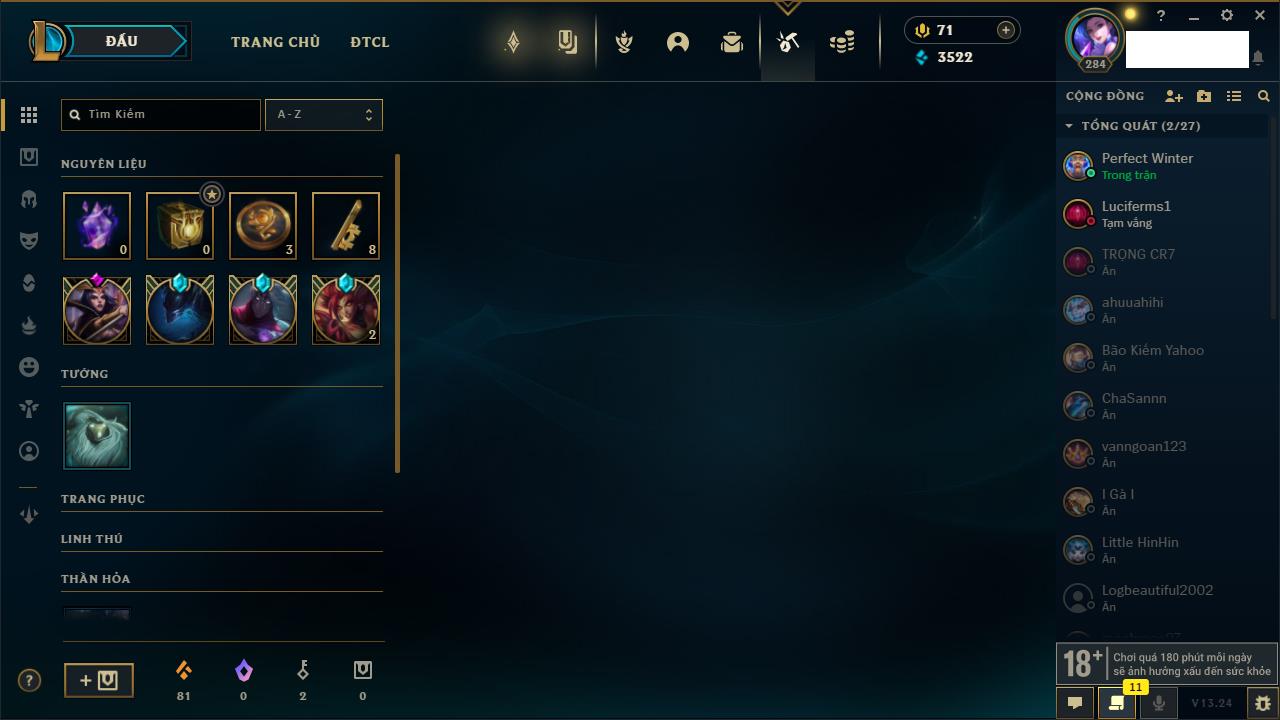 Rank Đơn: Bạc IIKhung: Bạch kimTướng: 169 - Còn 81813 THXTrang Phục: 301Rank ĐTCL: Chưa RankLinh Thú: 140