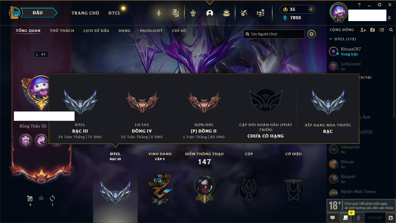 Rank Đơn: Bạc IIKhung: VàngTướng: 171 - Còn 332462 THXTrang Phục: 165Rank ĐTCL: Kim Cương IVLinh Thú: 181