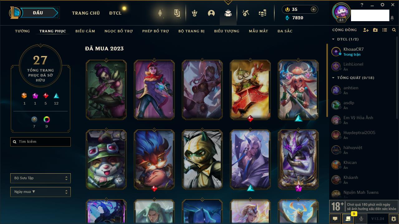 Rank Đơn: Vàng IVKhung: VàngTướng: 171 - Còn 48721 THXTrang Phục: 171Rank ĐTCL: Chưa RankLinh Thú: 27