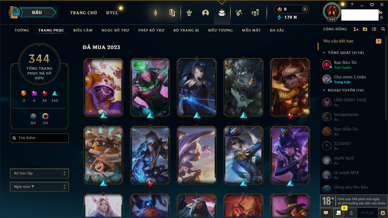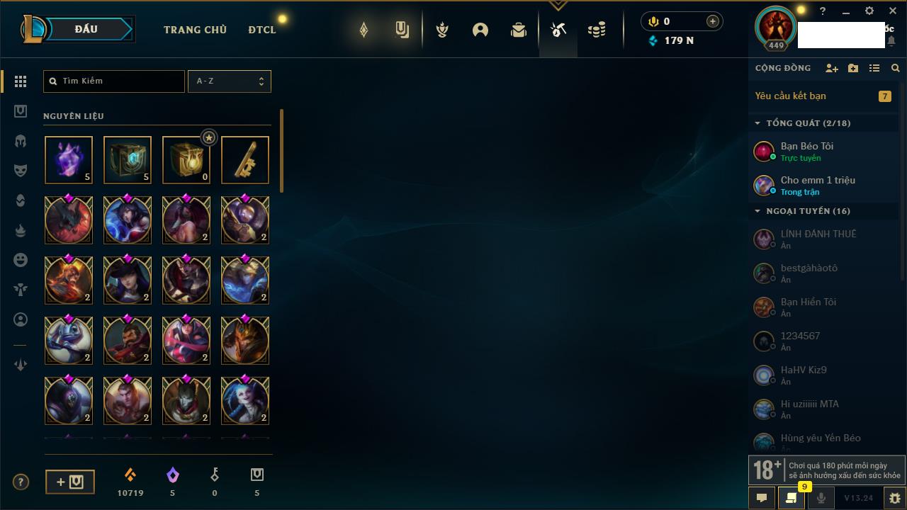 Rank Đơn: Đồng IIKhung: Chưa có khungTướng: 170 - Còn 2078 THXTrang Phục: 72Rank ĐTCL: Đồng ILinh Thú: 133