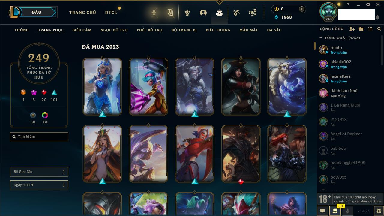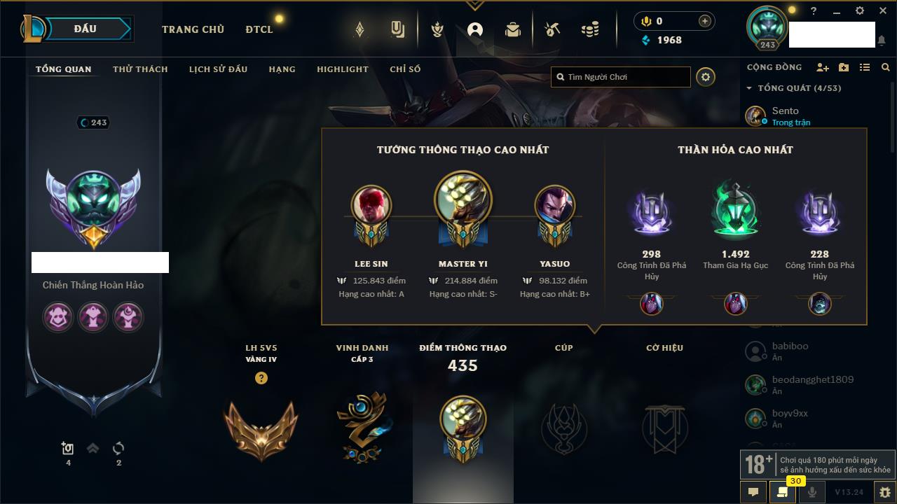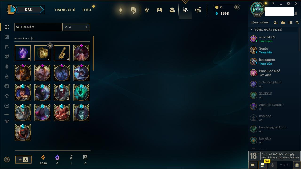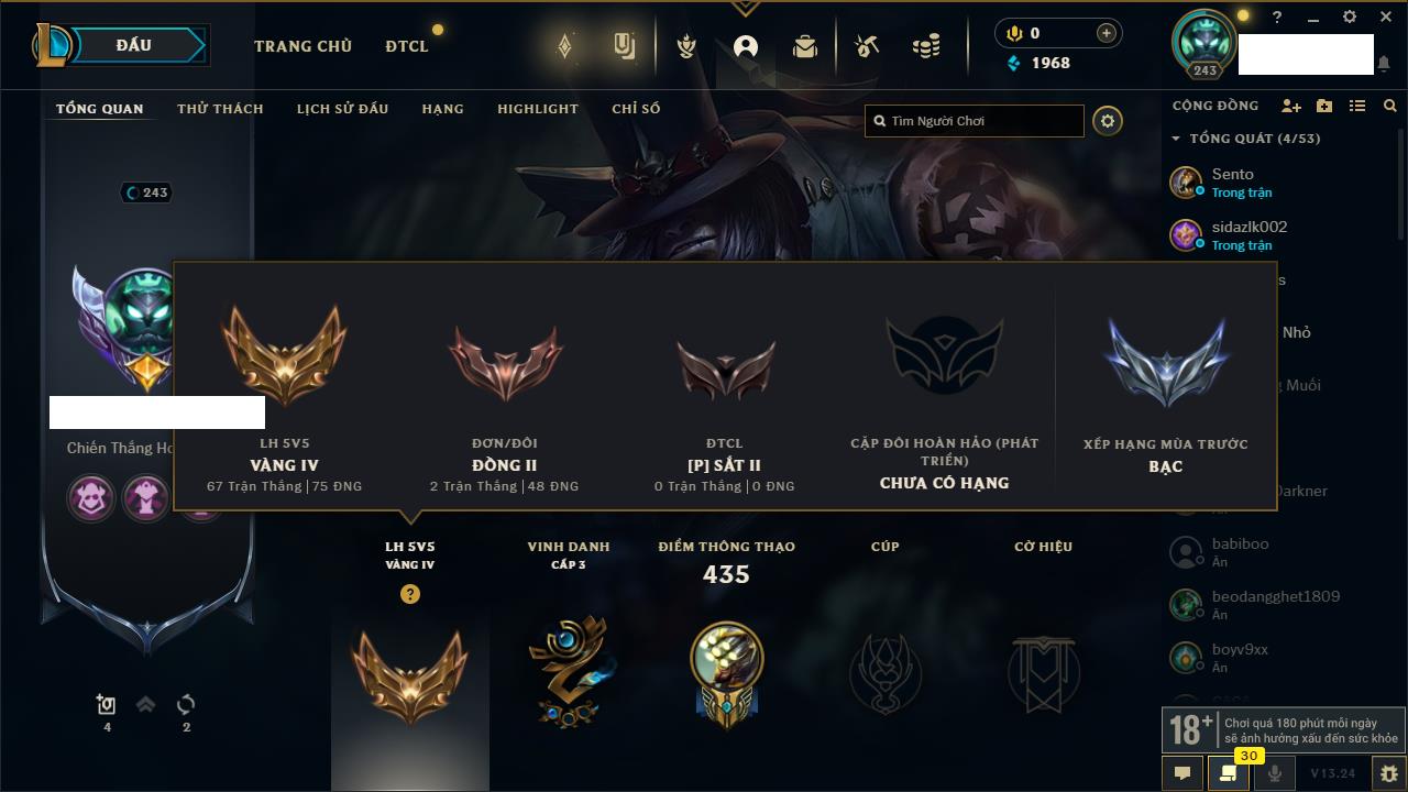 Rank Đơn: Vàng IIIKhung: BạcTướng: 171 - Còn 101359 THXTrang Phục: 88Rank ĐTCL: Kim Cương IVLinh Thú: 200