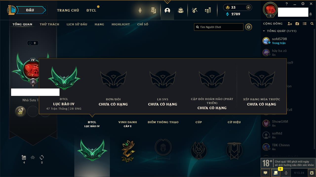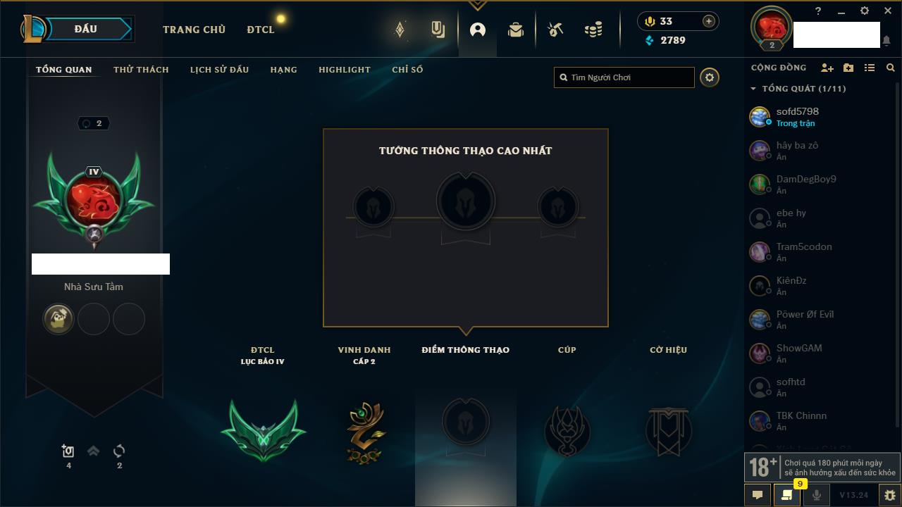 Rank Đơn: Chưa rank mùa nàoKhung: Chưa có khungTướng: 4 - Còn 30300 THXTrang Phục: 0Rank ĐTCL: Bạch Kim IVLinh Thú: 36