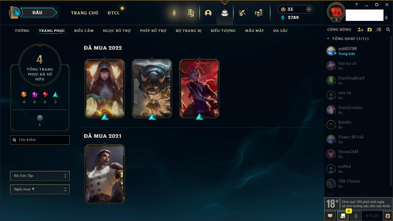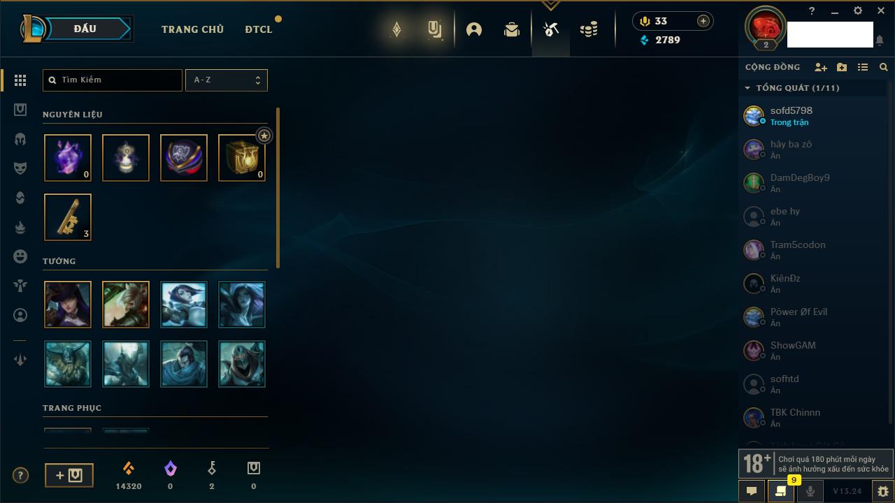 Rank Đơn: Chưa RankKhung: Chưa có khungTướng: 157 - Còn 6232 THXTrang Phục: 60Rank ĐTCL: Chưa RankLinh Thú: 89