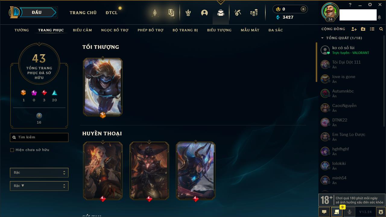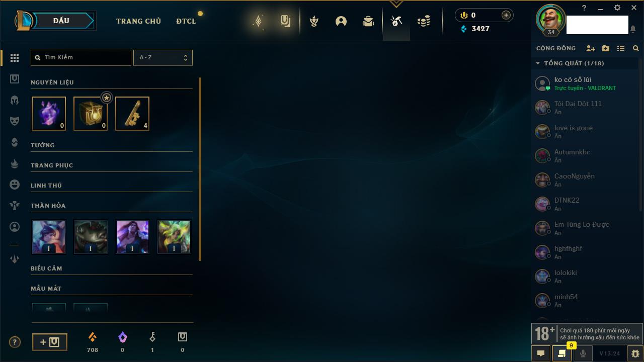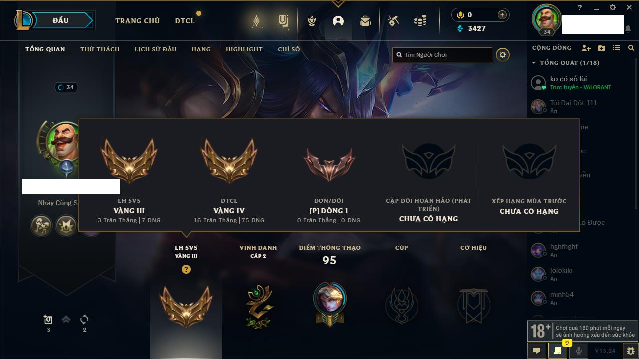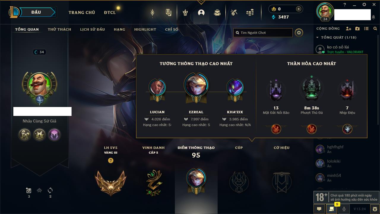 Rank Đơn: Chưa rank mùa nàoKhung: Chưa có khungTướng: 158 - Còn 6970 THXTrang Phục: 32Rank ĐTCL: Chưa RankLinh Thú: 24