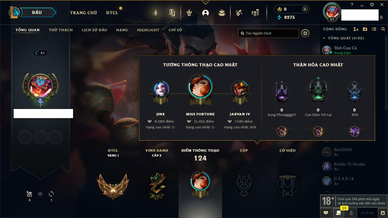 Rank Đơn: Chưa rank mùa nàoKhung: Chưa có khungTướng: 12 - Còn 3853 THXTrang Phục: 2Rank ĐTCL: Chưa RankLinh Thú: 30