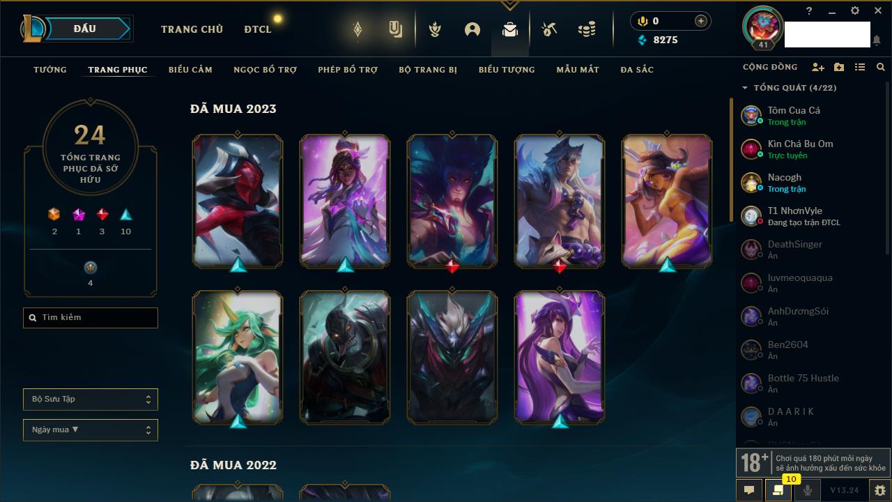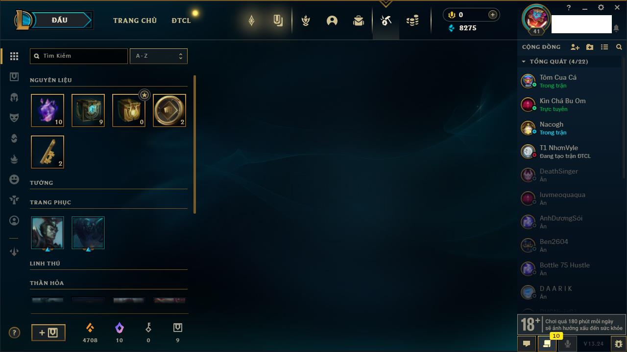 Rank Đơn: Chưa rank mùa nàoKhung: Chưa có khungTướng: 158 - Còn 6970 THXTrang Phục: 32Rank ĐTCL: Chưa RankLinh Thú: 24