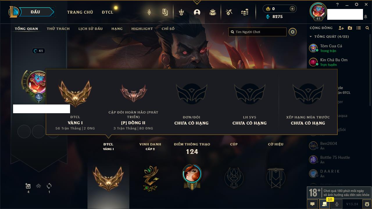 Rank Đơn: Chưa rank mùa nàoKhung: Chưa có khungTướng: 36 - Còn 190 THXTrang Phục: 14Rank ĐTCL: Chưa RankLinh Thú: 65