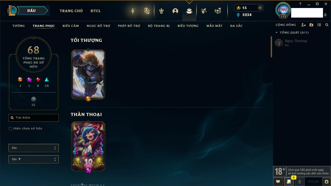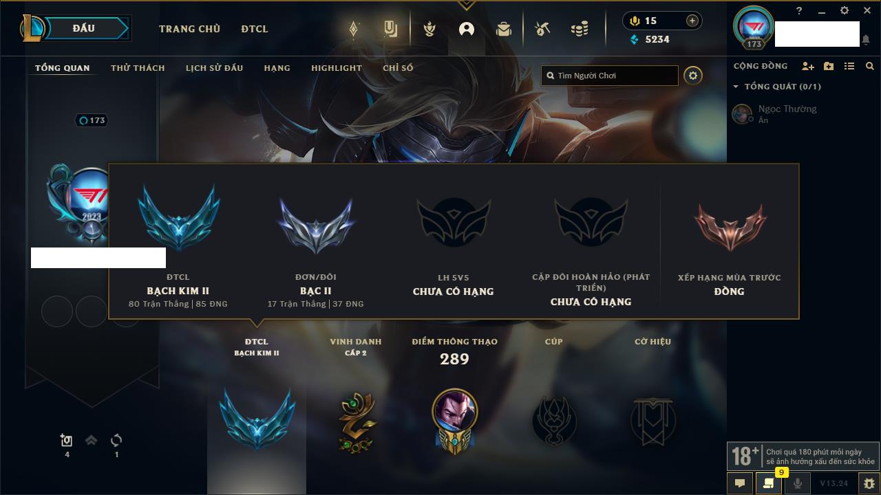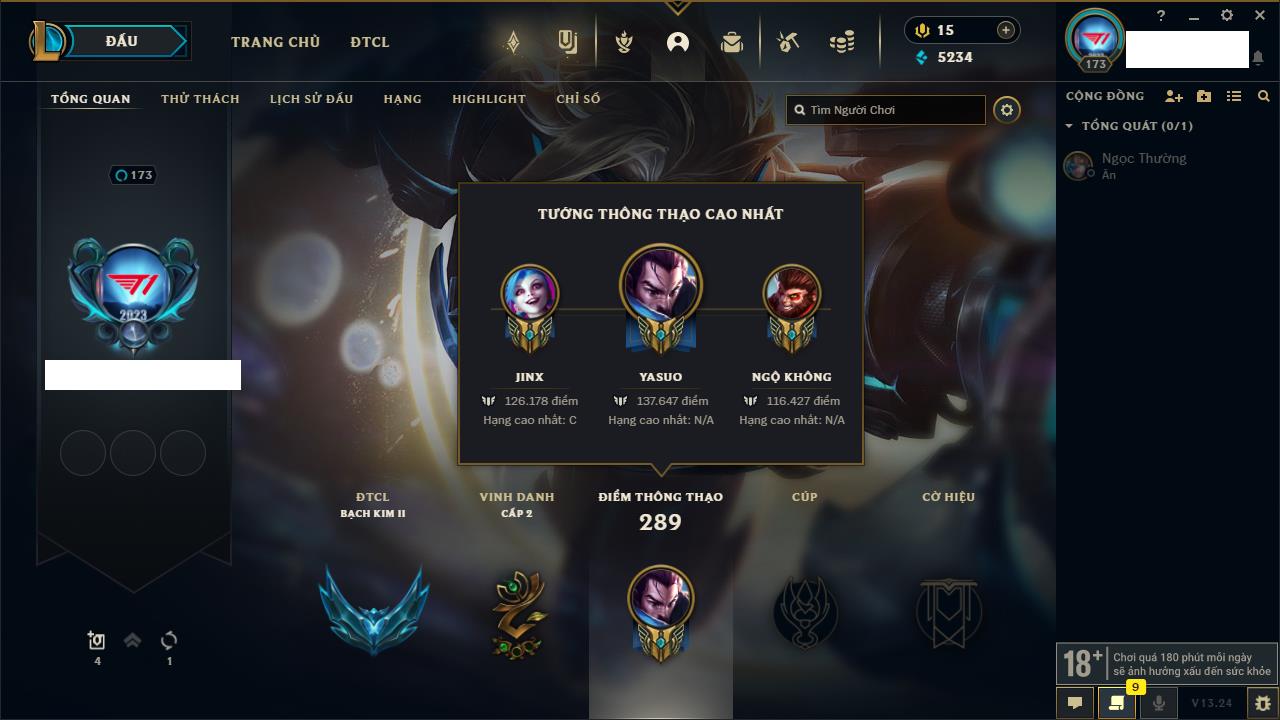 Rank Đơn: Đồng IIIKhung: Chưa có khungTướng: 167 - Còn 22819 THXTrang Phục: 132Rank ĐTCL: Chưa RankLinh Thú: 132