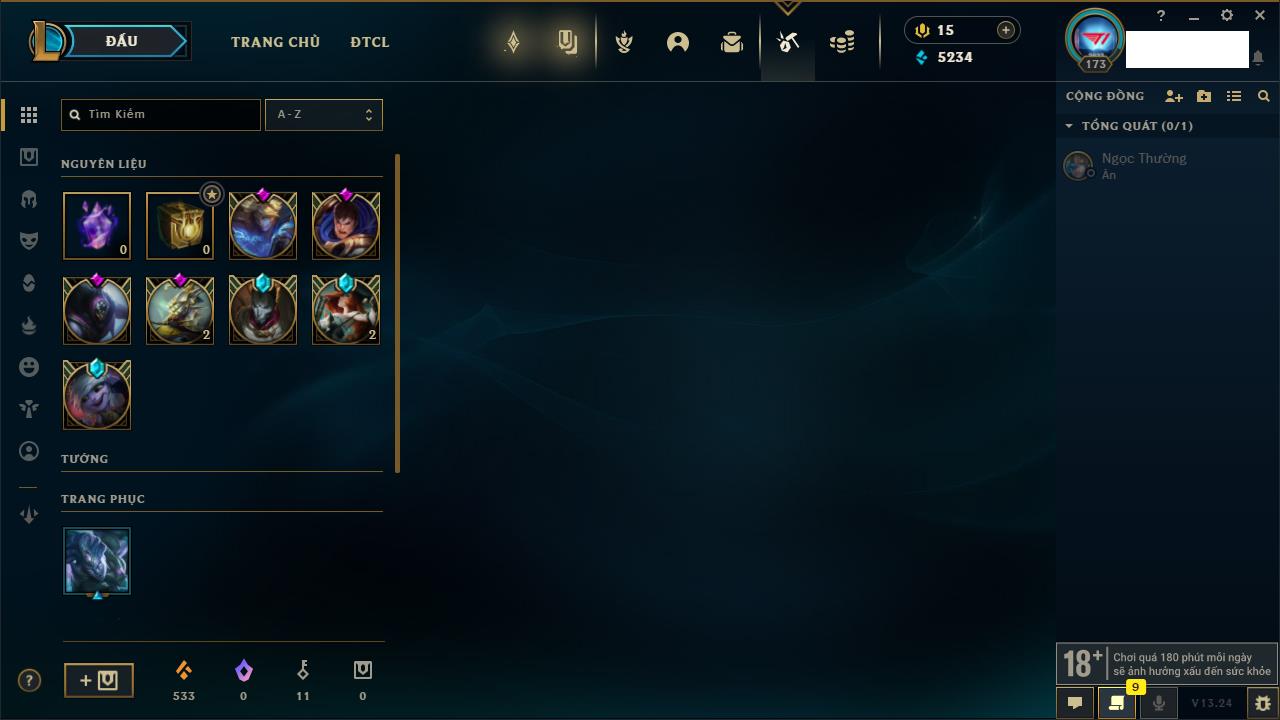 Rank Đơn: Đồng IVKhung: Chưa có khungTướng: 171 - Còn 145802 THXTrang Phục: 66Rank ĐTCL: Lục Bảo IILinh Thú: 127