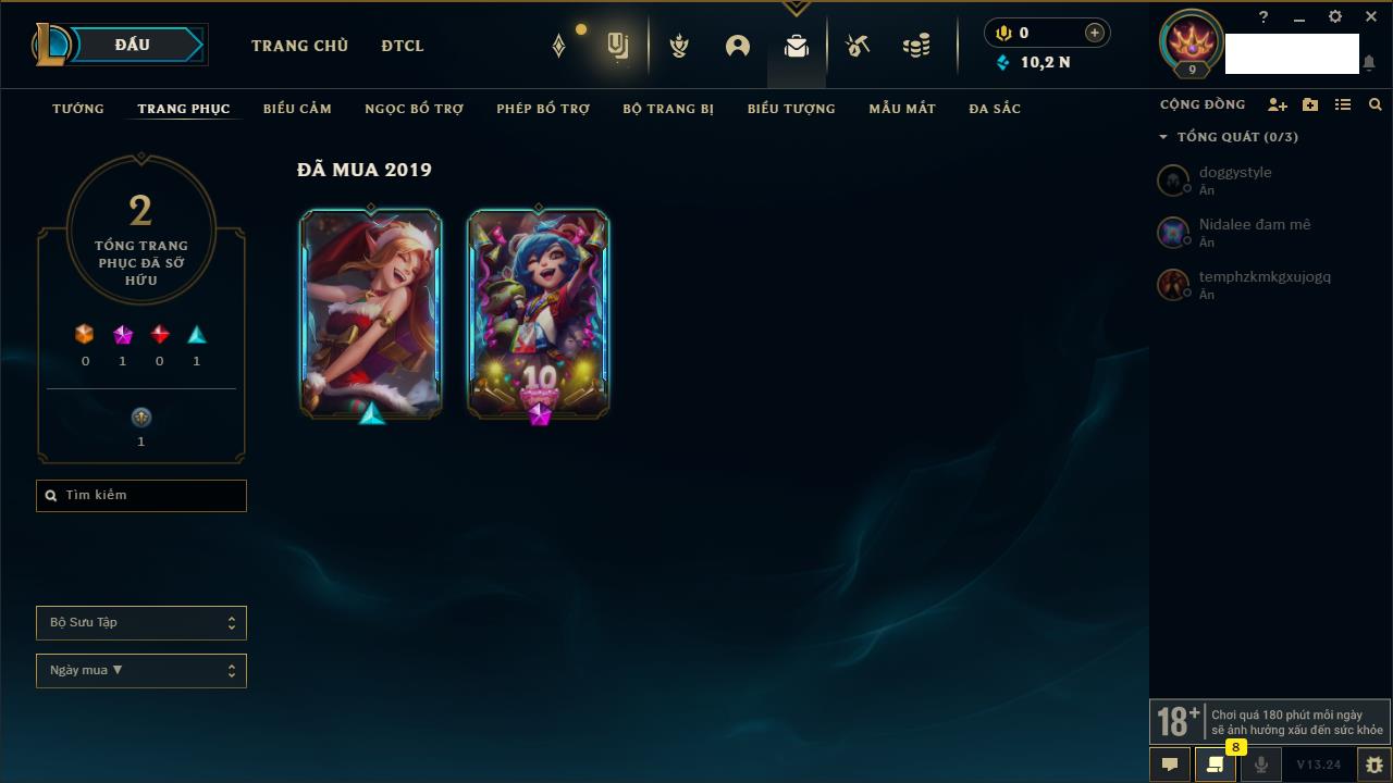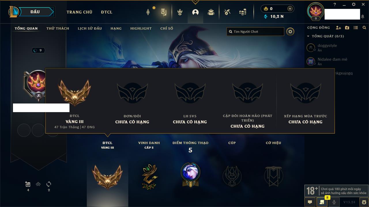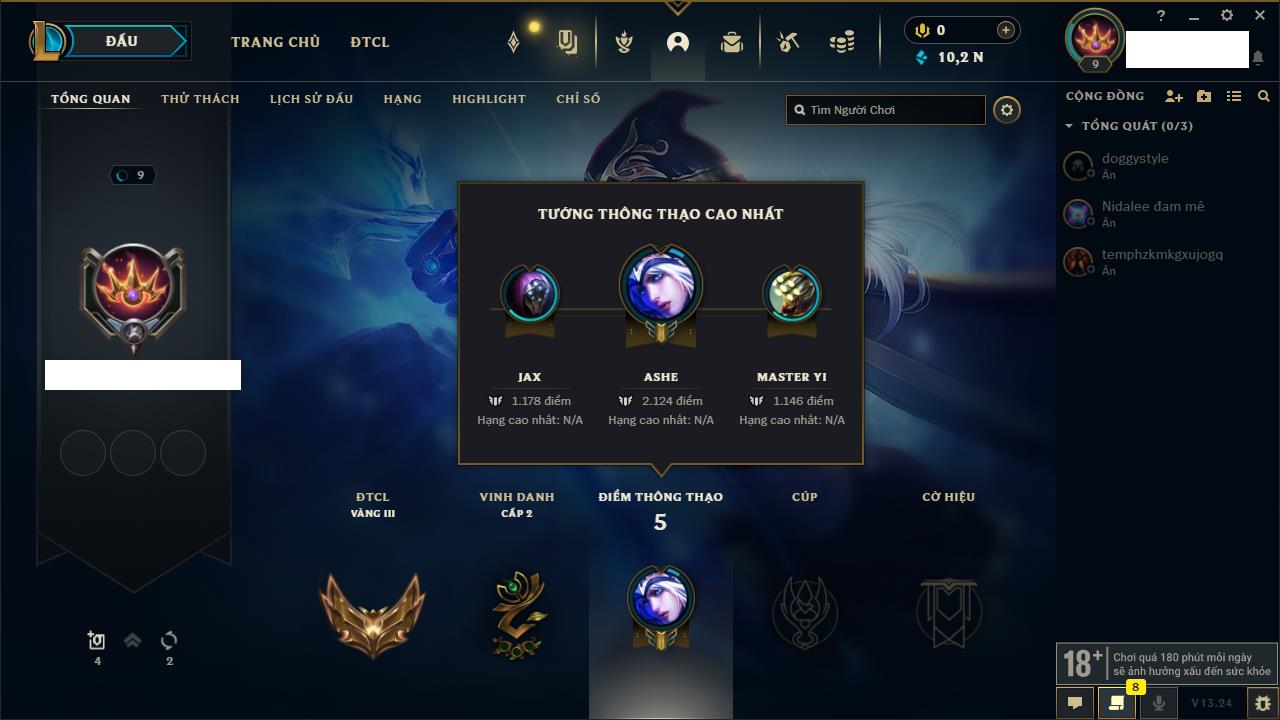 Rank Đơn: Chưa rank mùa nàoKhung: Chưa có khungTướng: 2 - Còn 8000 THXTrang Phục: 0Rank ĐTCL: Chưa RankLinh Thú: 38