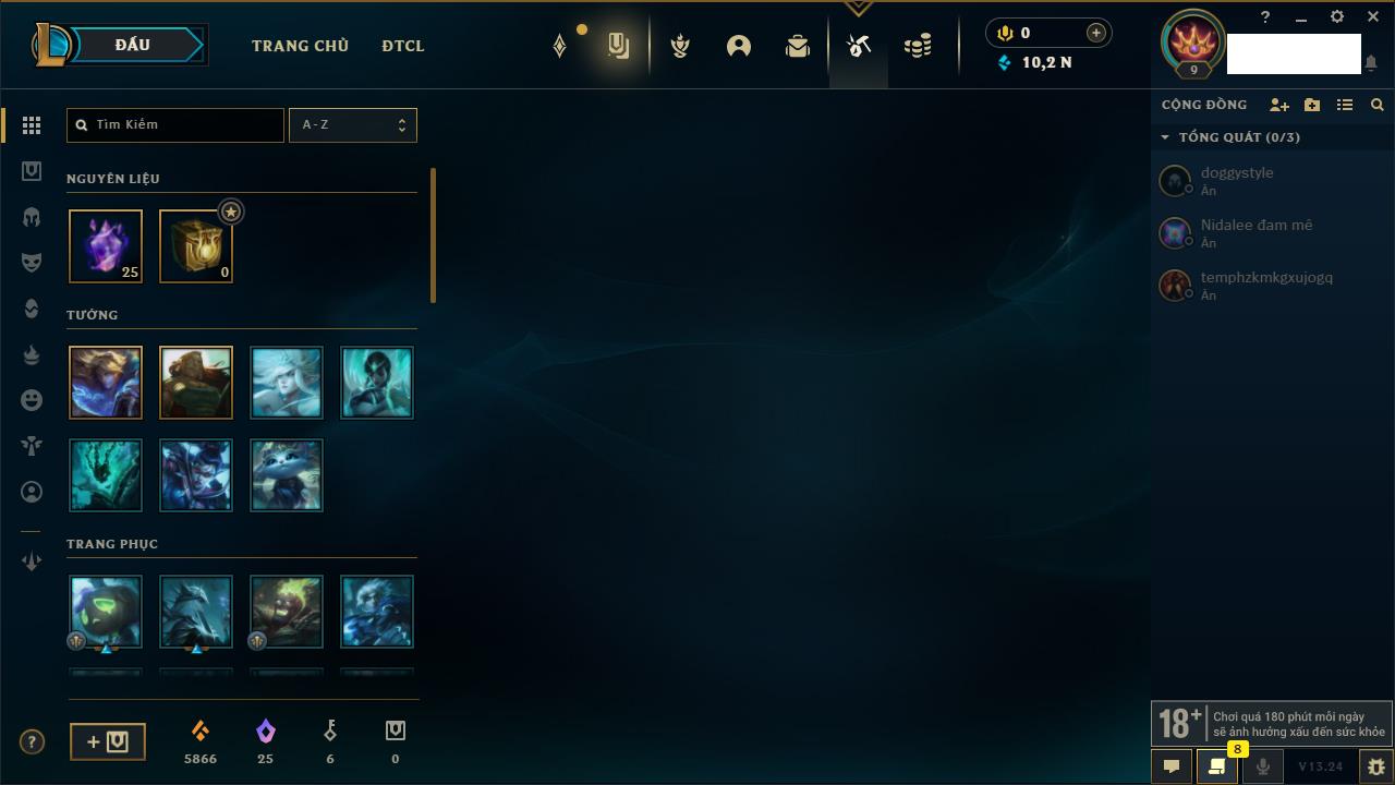Rank Đơn: Chưa rank mùa nàoKhung: Chưa có khungTướng: 0 - Còn 6800 THXTrang Phục: 0Rank ĐTCL: Chưa RankLinh Thú: 24
