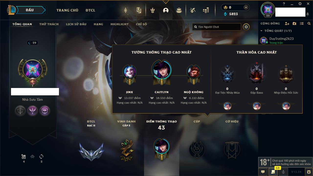 Rank Đơn: Chưa rank mùa nàoKhung: Chưa có khungTướng: 12 - Còn 3853 THXTrang Phục: 2Rank ĐTCL: Chưa RankLinh Thú: 30