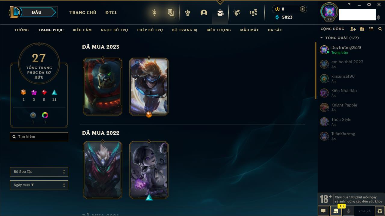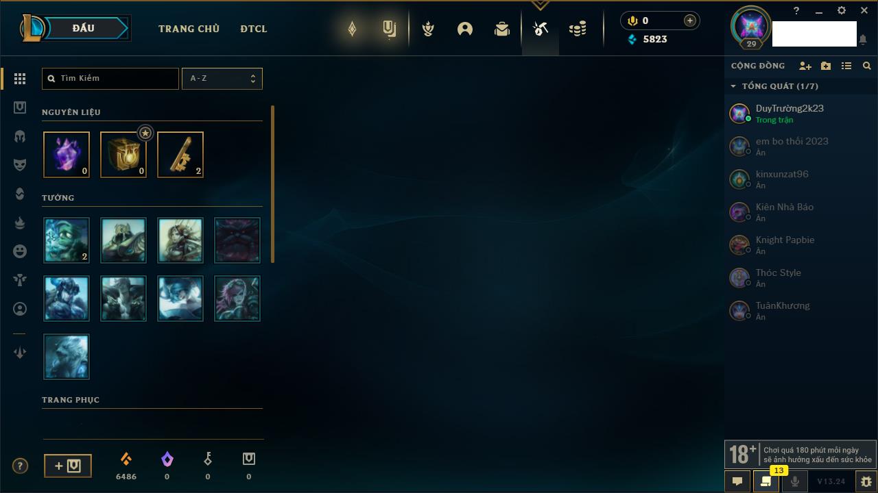 Rank Đơn: Chưa rank mùa nàoKhung: Chưa có khungTướng: 158 - Còn 6970 THXTrang Phục: 32Rank ĐTCL: Chưa RankLinh Thú: 24
