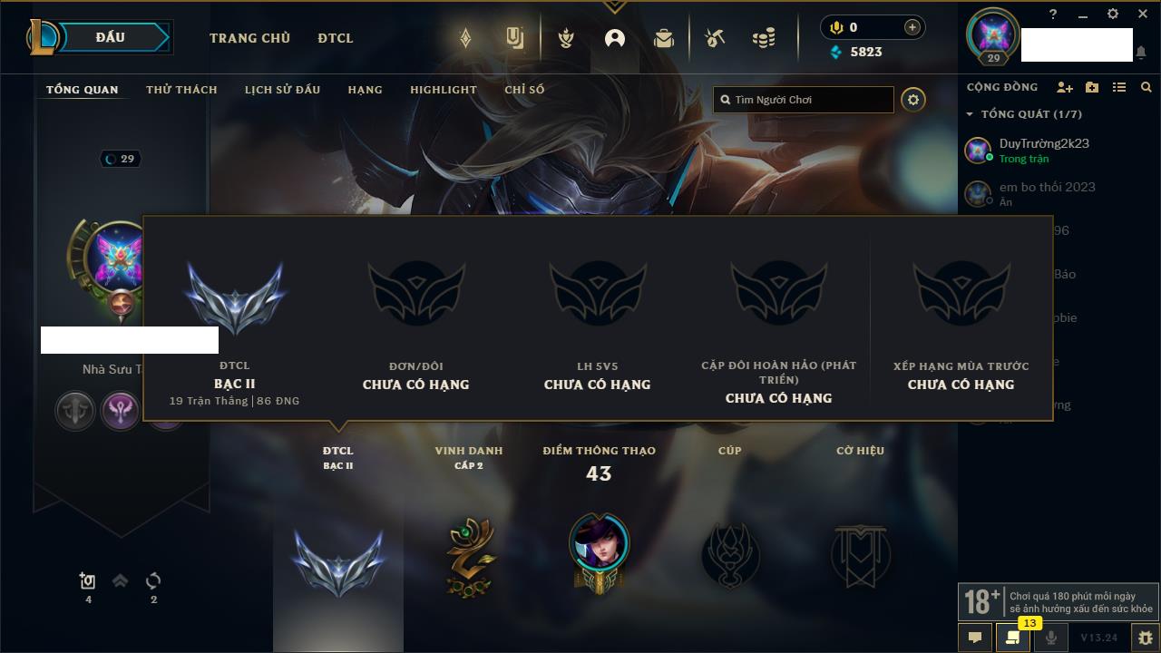 Rank Đơn: Chưa rank mùa nàoKhung: Chưa có khungTướng: 36 - Còn 190 THXTrang Phục: 14Rank ĐTCL: Chưa RankLinh Thú: 65