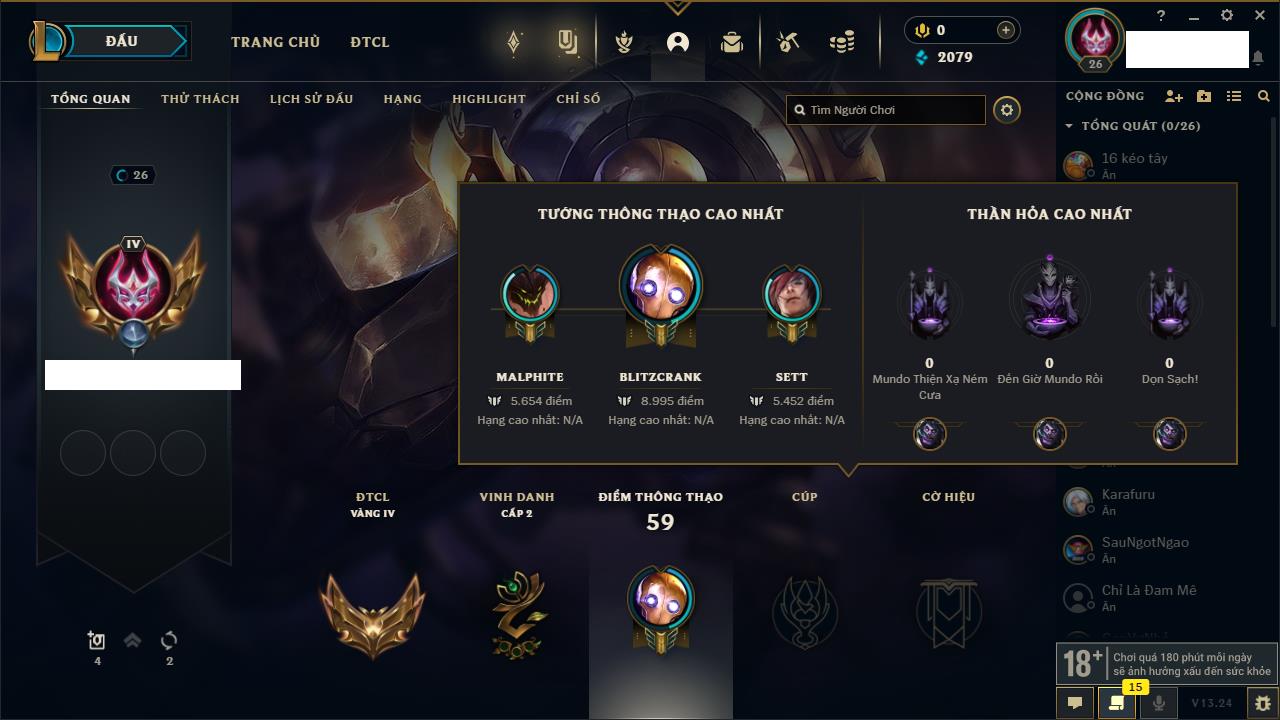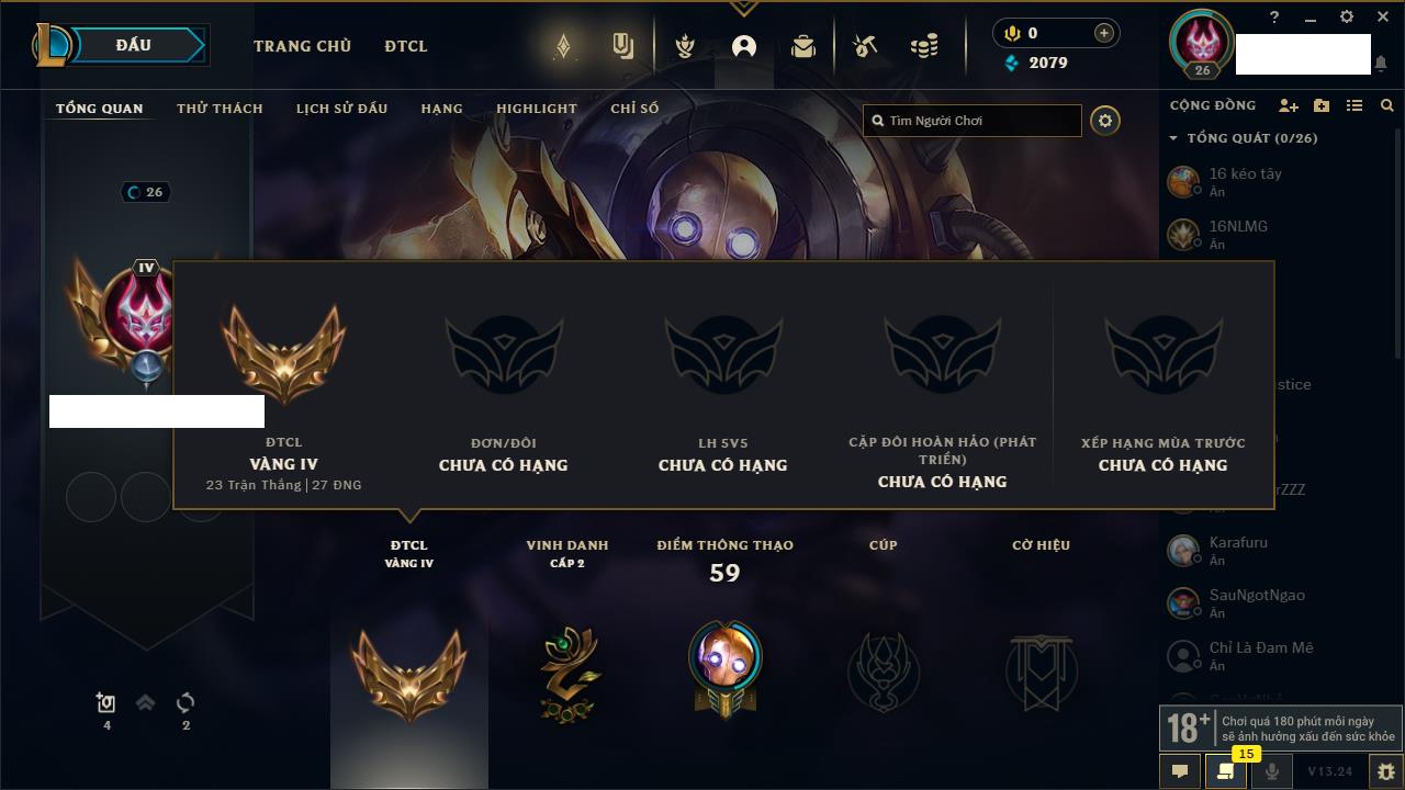 Rank Đơn: Chưa rank mùa nàoKhung: Chưa có khungTướng: 156 - Còn 18550 THXTrang Phục: 4Rank ĐTCL: Chưa RankLinh Thú: 75