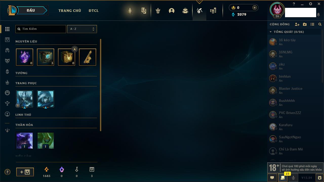 Rank Đơn: Chưa rank mùa nàoKhung: Chưa có khungTướng: 161 - Còn 4118 THXTrang Phục: 18Rank ĐTCL: Chưa RankLinh Thú: 86
