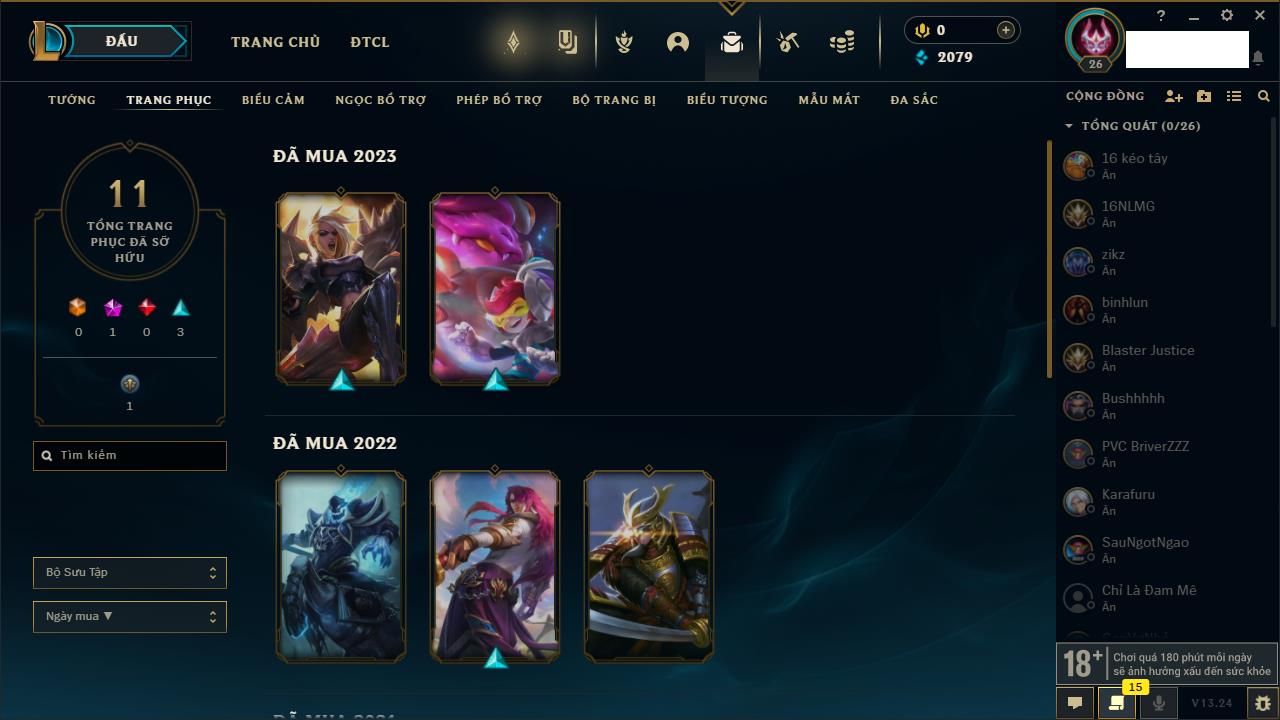 Rank Đơn: Chưa rank mùa nàoKhung: Chưa có khungTướng: 157 - Còn 2079 THXTrang Phục: 11Rank ĐTCL: Chưa RankLinh Thú: 70