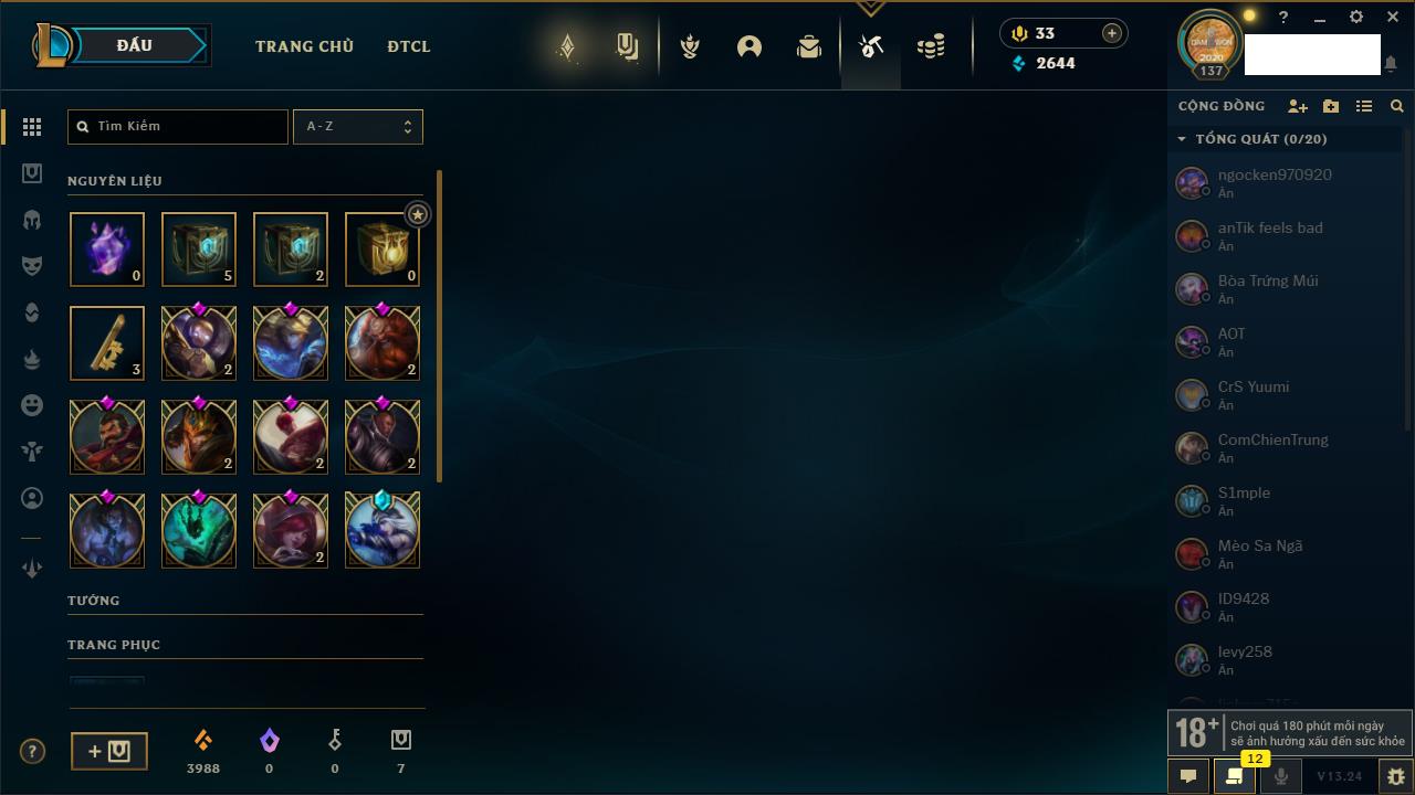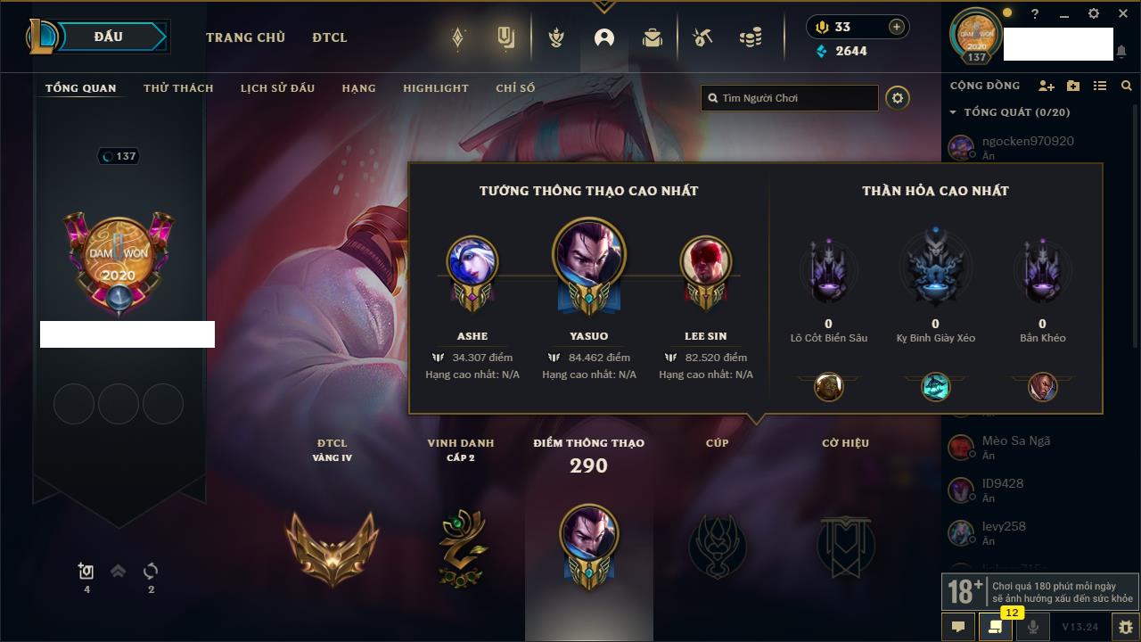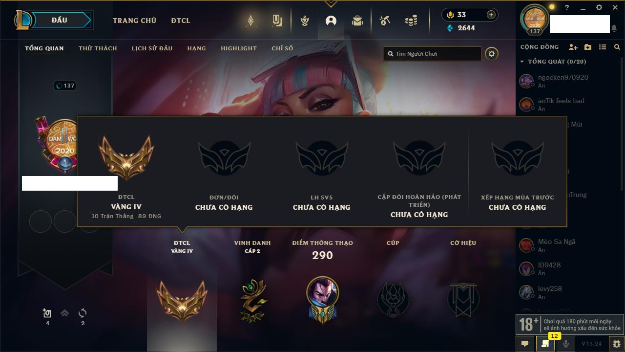 Rank Đơn: Chưa rank mùa nàoKhung: Chưa có khungTướng: 156 - Còn 18550 THXTrang Phục: 4Rank ĐTCL: Chưa RankLinh Thú: 75