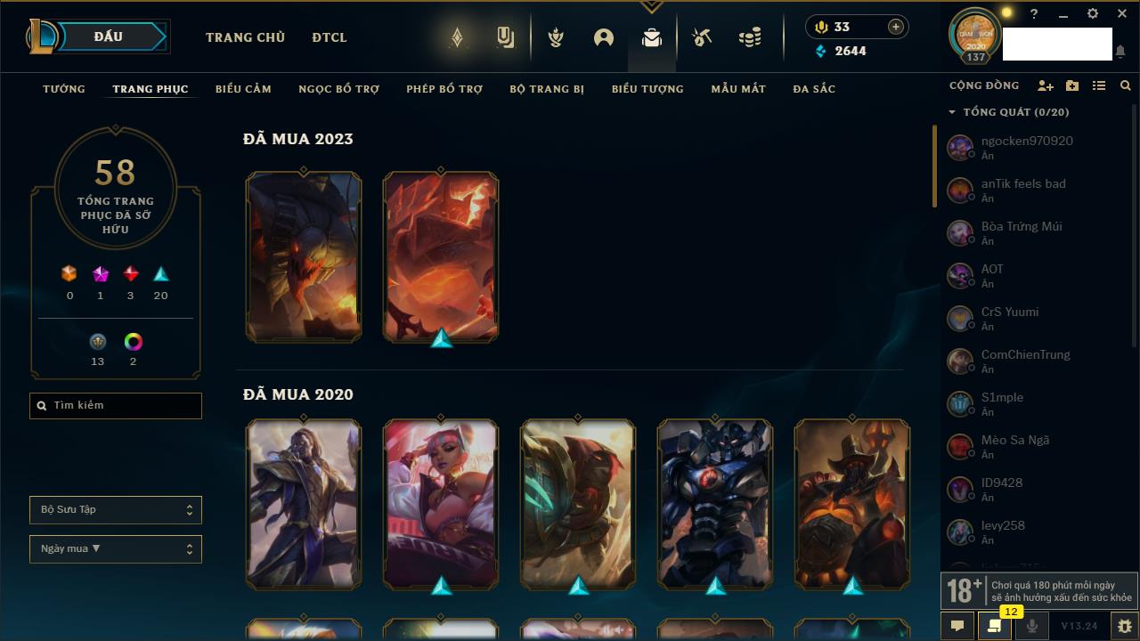 Rank Đơn: Chưa rank mùa nàoKhung: Chưa có khungTướng: 157 - Còn 2079 THXTrang Phục: 11Rank ĐTCL: Chưa RankLinh Thú: 70