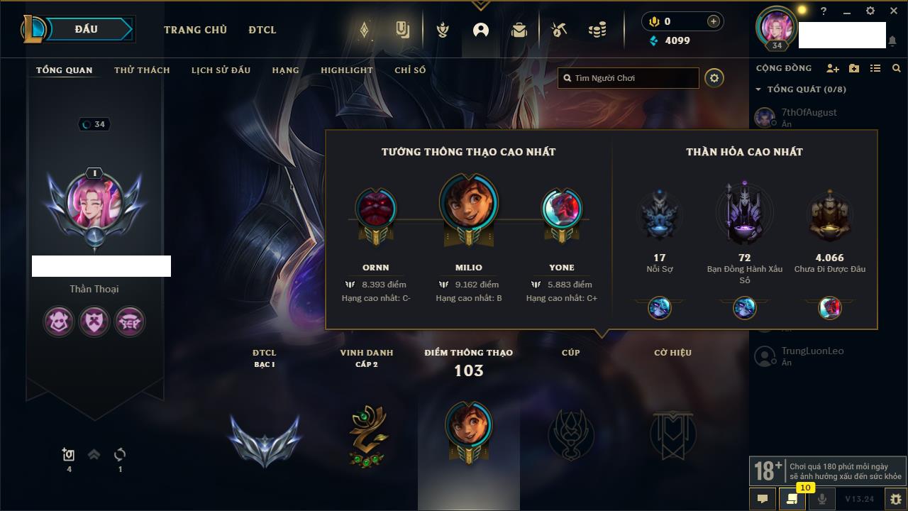 Rank Đơn: Chưa rank mùa nàoKhung: Chưa có khungTướng: 12 - Còn 3853 THXTrang Phục: 2Rank ĐTCL: Chưa RankLinh Thú: 30