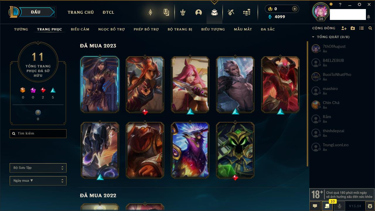 Rank Đơn: Chưa rank mùa nàoKhung: Chưa có khungTướng: 158 - Còn 6970 THXTrang Phục: 32Rank ĐTCL: Chưa RankLinh Thú: 24