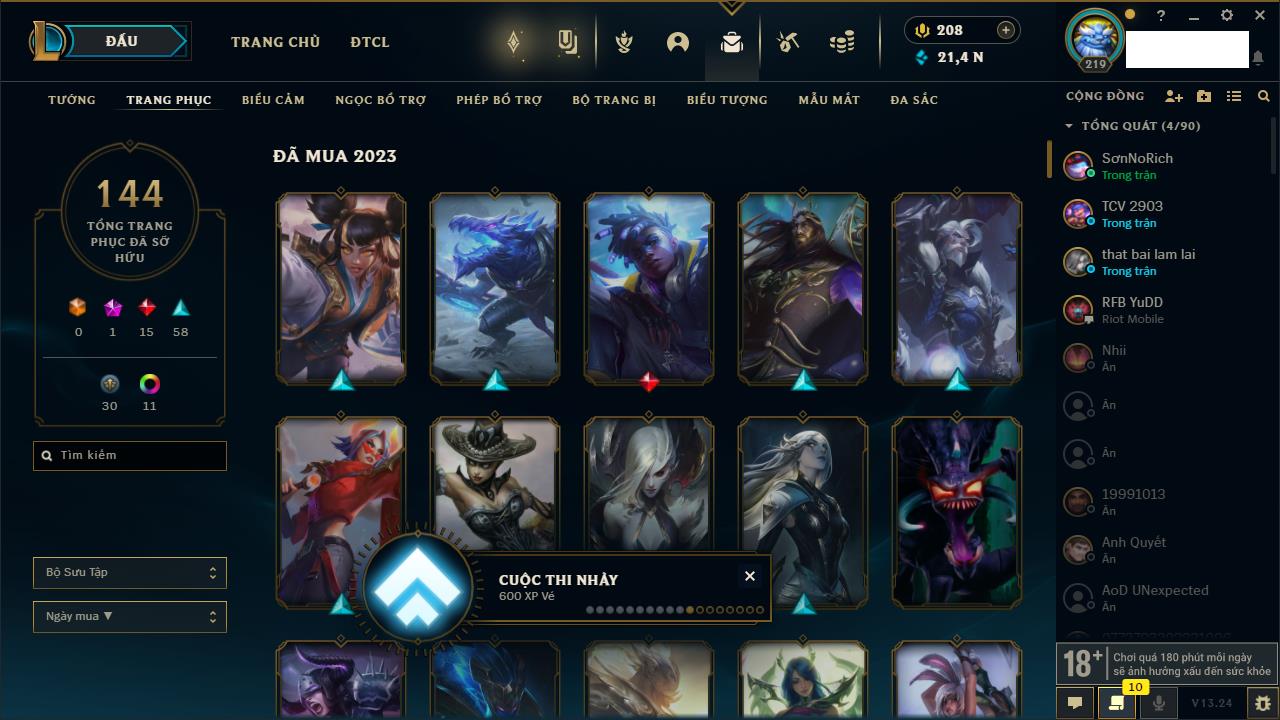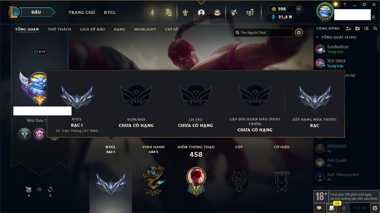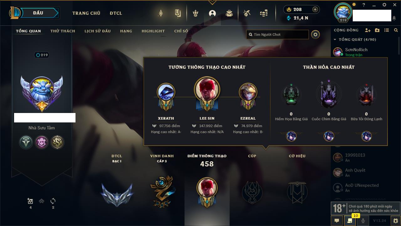 Rank Đơn: Chưa RankKhung: Chưa có khungTướng: 148 - Còn 2211 THXTrang Phục: 97Rank ĐTCL: Chưa RankLinh Thú: 77