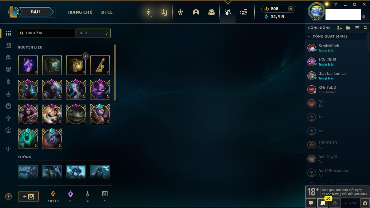 Rank Đơn: Chưa RankKhung: Chưa có khungTướng: 162 - Còn 86599 THXTrang Phục: 147Rank ĐTCL: Chưa RankLinh Thú: 101