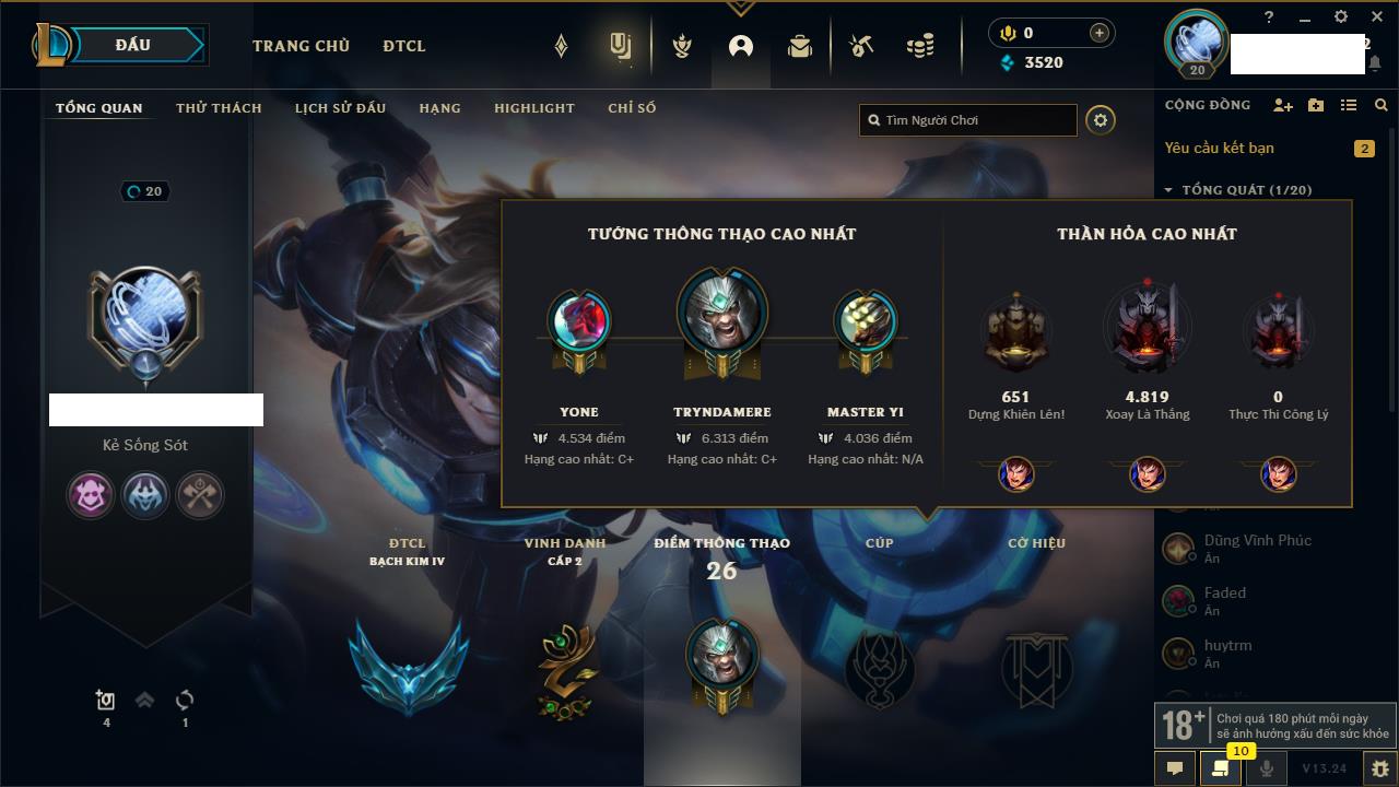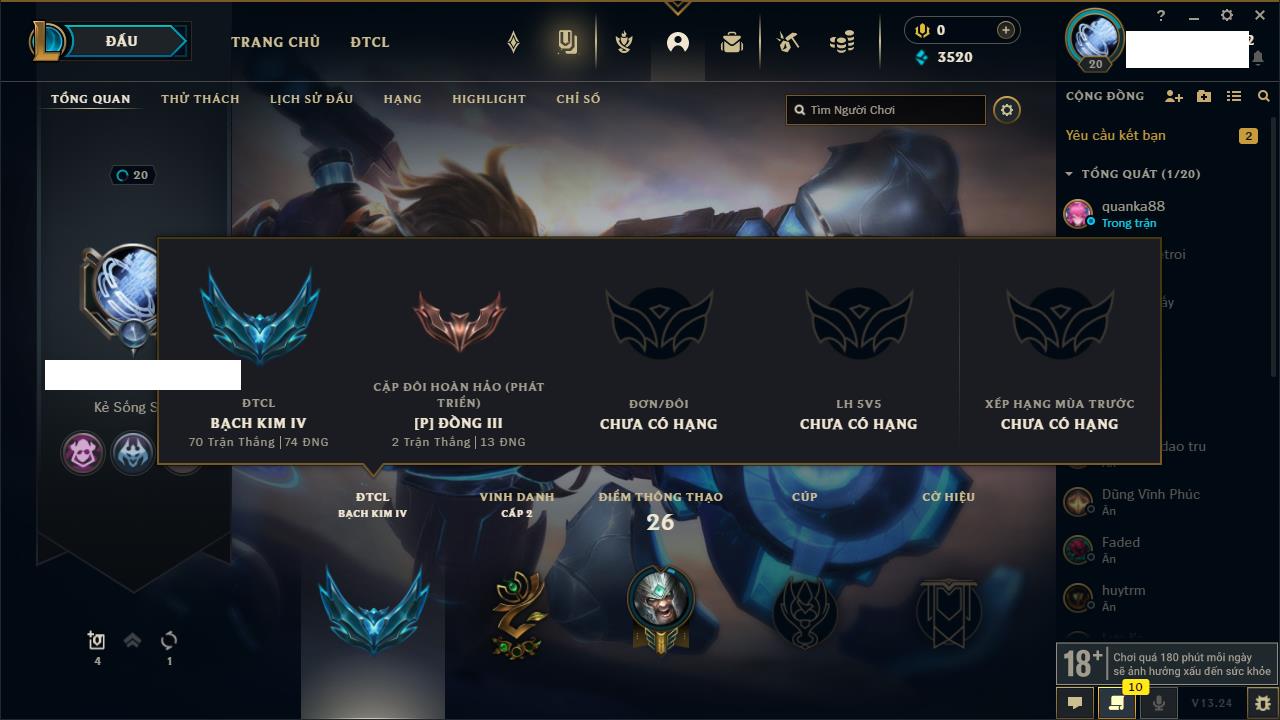 Rank Đơn: Đồng IIKhung: Chưa có khungTướng: 153 - Còn 32832 THXTrang Phục: 66Rank ĐTCL: Chưa RankLinh Thú: 7