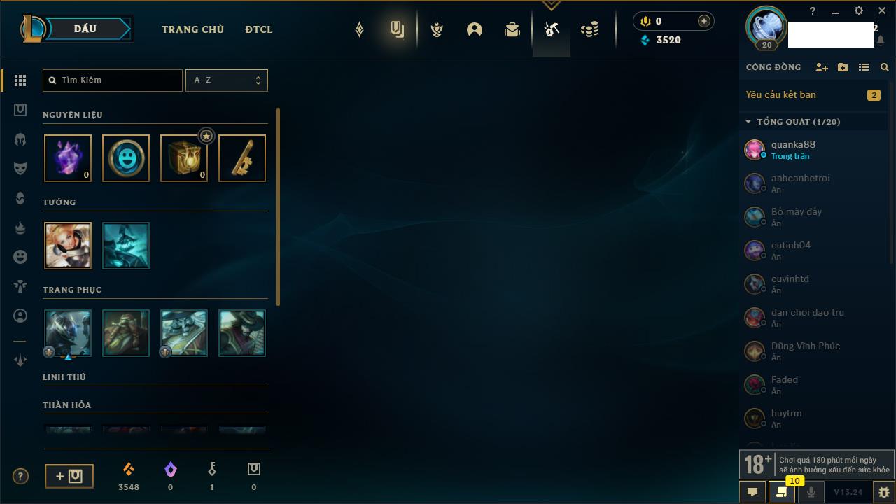 Rank Đơn: Chưa RankKhung: Chưa có khungTướng: 158 - Còn 22848 THXTrang Phục: 72Rank ĐTCL: Chưa RankLinh Thú: 52